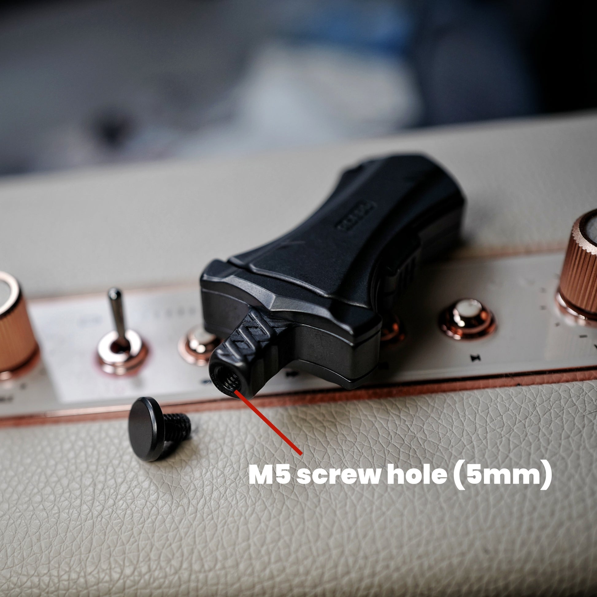 Unscrew the circular disc at the top of the sword handle, and you will see a screw hole. Its specification is M5 (5mm diameter). By using appropriately sized bolts, you can connect any fidget spinner to the handle.