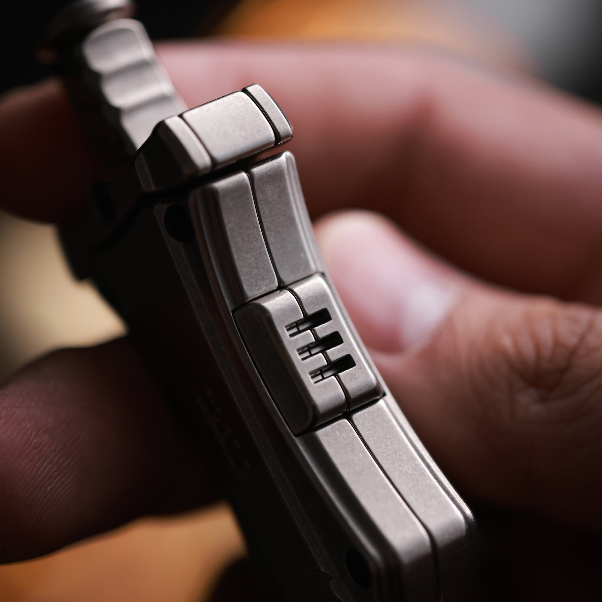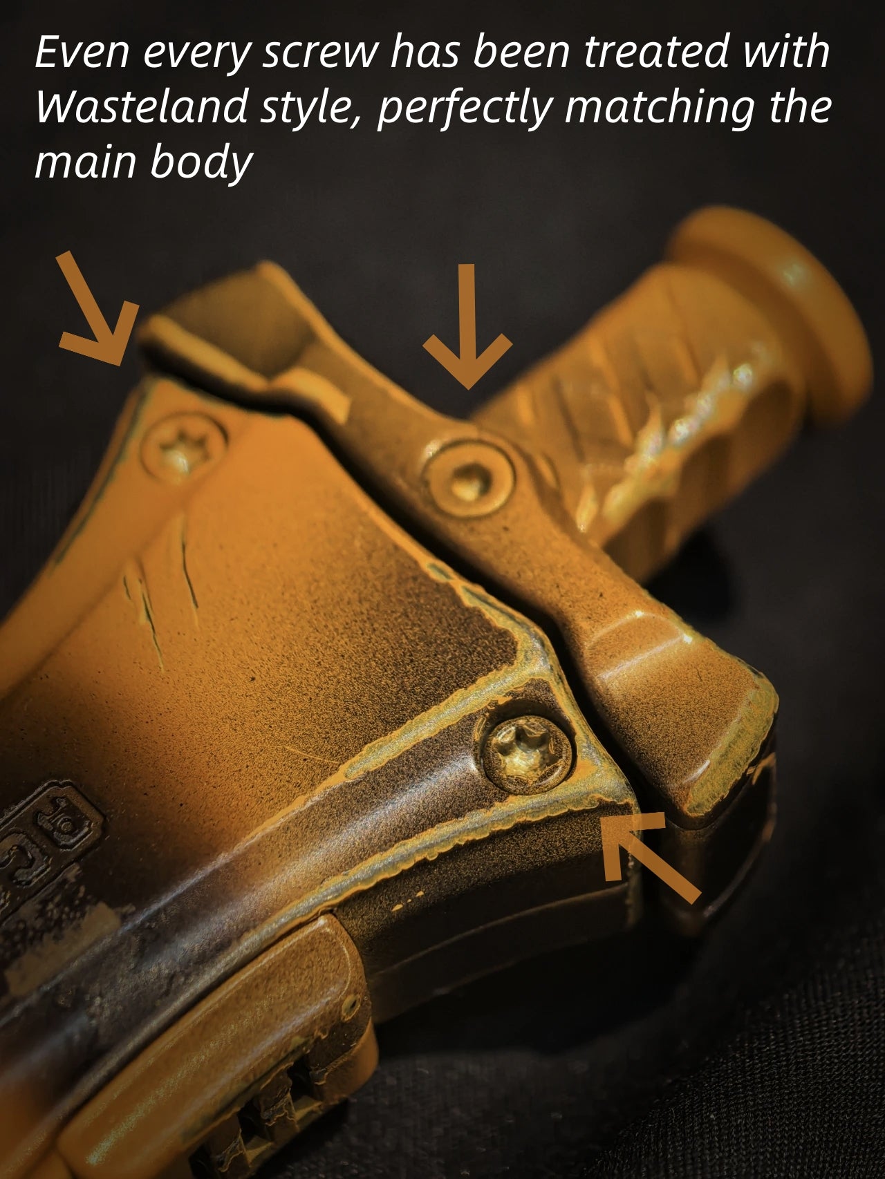 Ti ceramic coating, then hand processing to create a post apocalyptic wasteland effect. Even every screw has been treated with Wasteland style, perfectly matching the main body.
