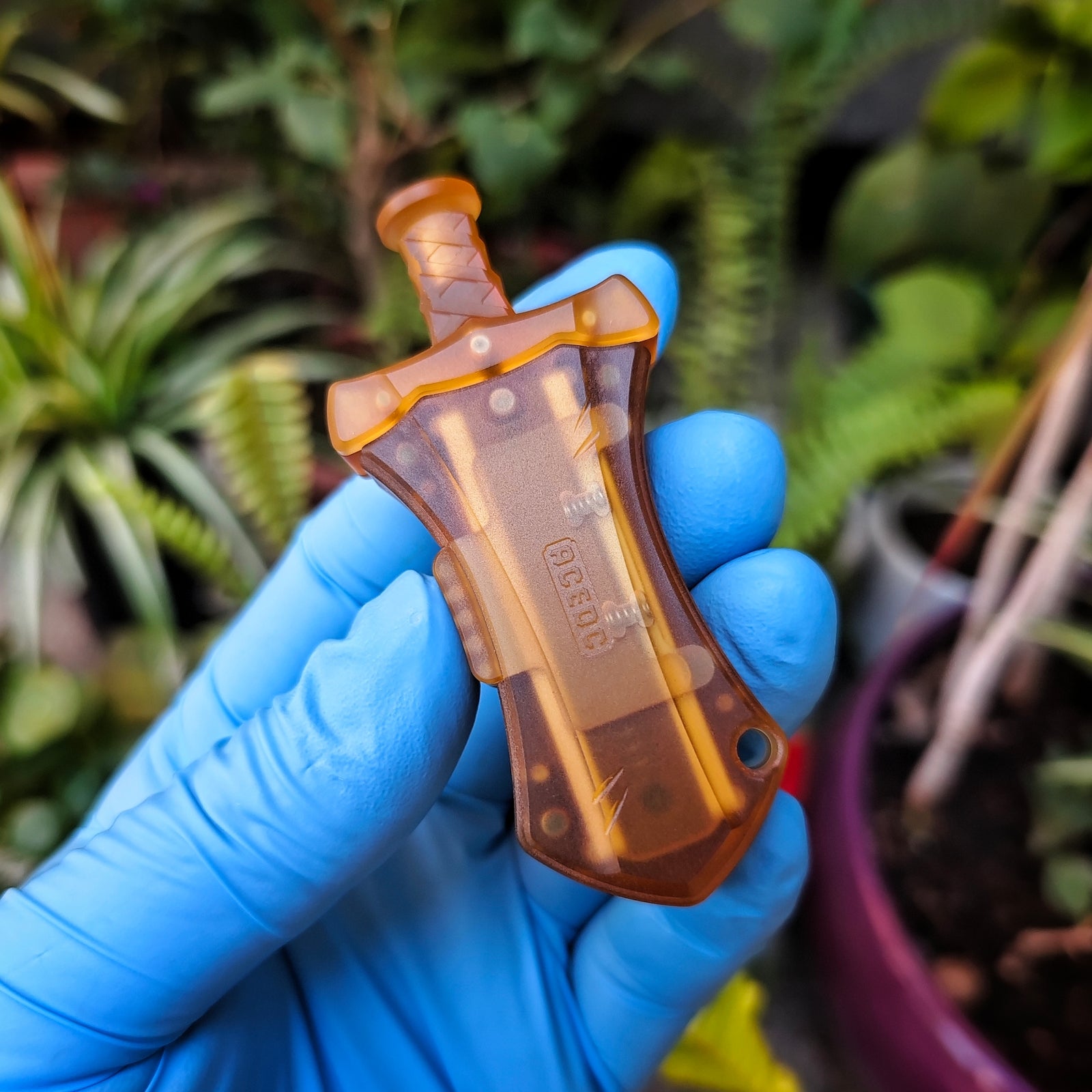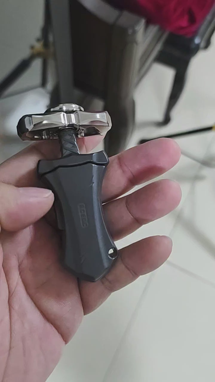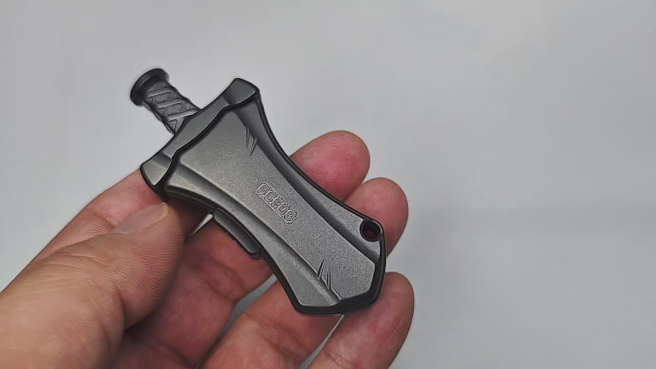 Master Sword is a mechanical bouncing EDC. Compact in design, so it can be carried around in the pocket. Press the side button and the blade will pop out. When pressing the handle, you will feel clear paragraph feedback and crisp sound. There are a total of 8 paragraphs. When locked to the bottom, there is a wonderful magnetic touch. If not pressed to the bottom, the blade will continue to pop out when released. The blade cannot be completely pulled out.