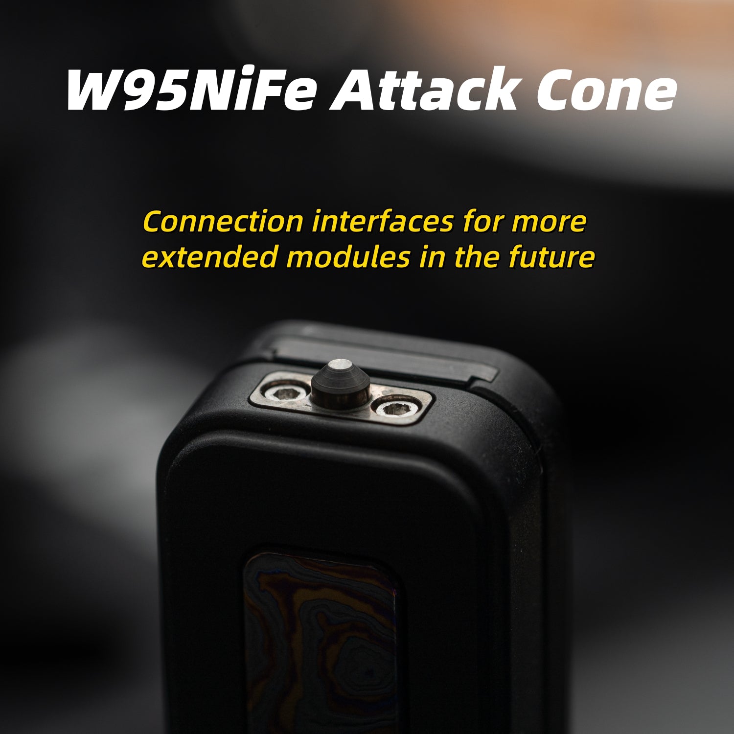 The mini spinner and attack cone are made of Tungsten alloy (W95NiFe) with a vacuum ion coating on the surface. Their density is twice that of copper. The surface of the mini spinner is finely carved with patterns, and the spinning light and shadow effect are extremely stunning.