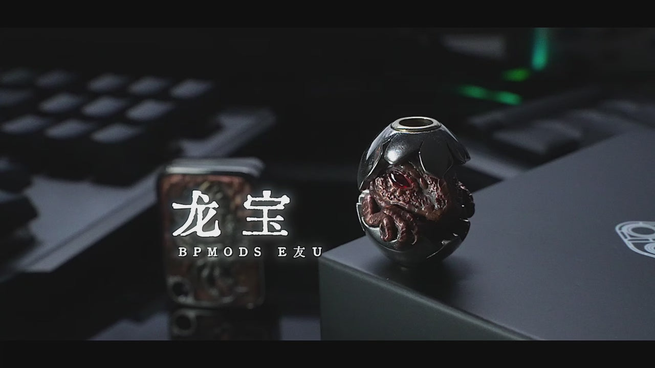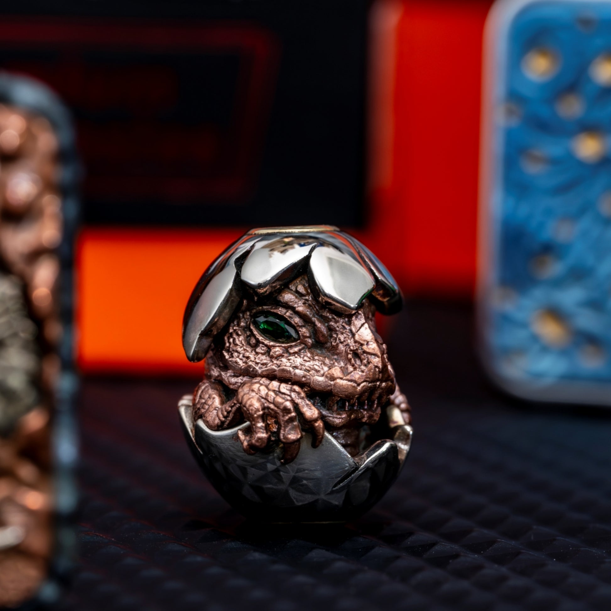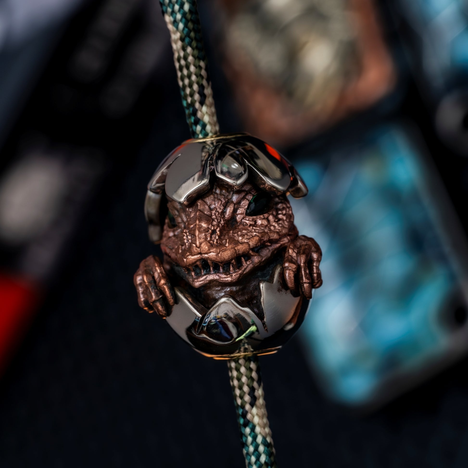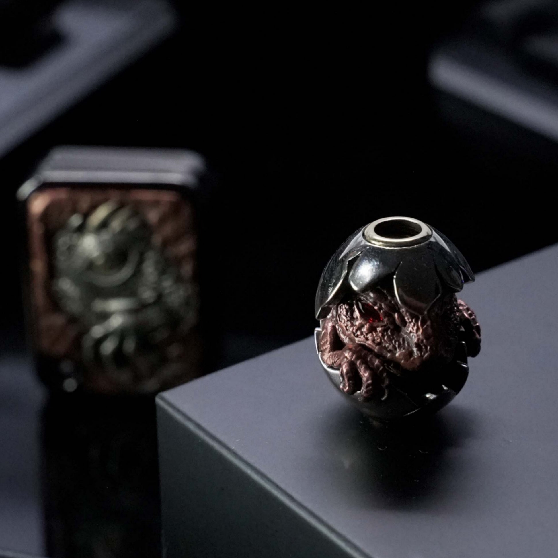 The Dragon Baby bead is a product designed together with the Devil Dragon. Eggshells are made of cupron material. Dragon Baby is made of brass/copper. The eyes are set with ruby. A seemingly simple pendant is made up of 10 parts that are color coded, carved, and inlaid. Dragon Baby hatched from the eggshell, symbolizing the birth of this product. It is recommended to tie the bead under the Devil Dragon slider, which will elevate it to a higher level in both appearance and grip feel.