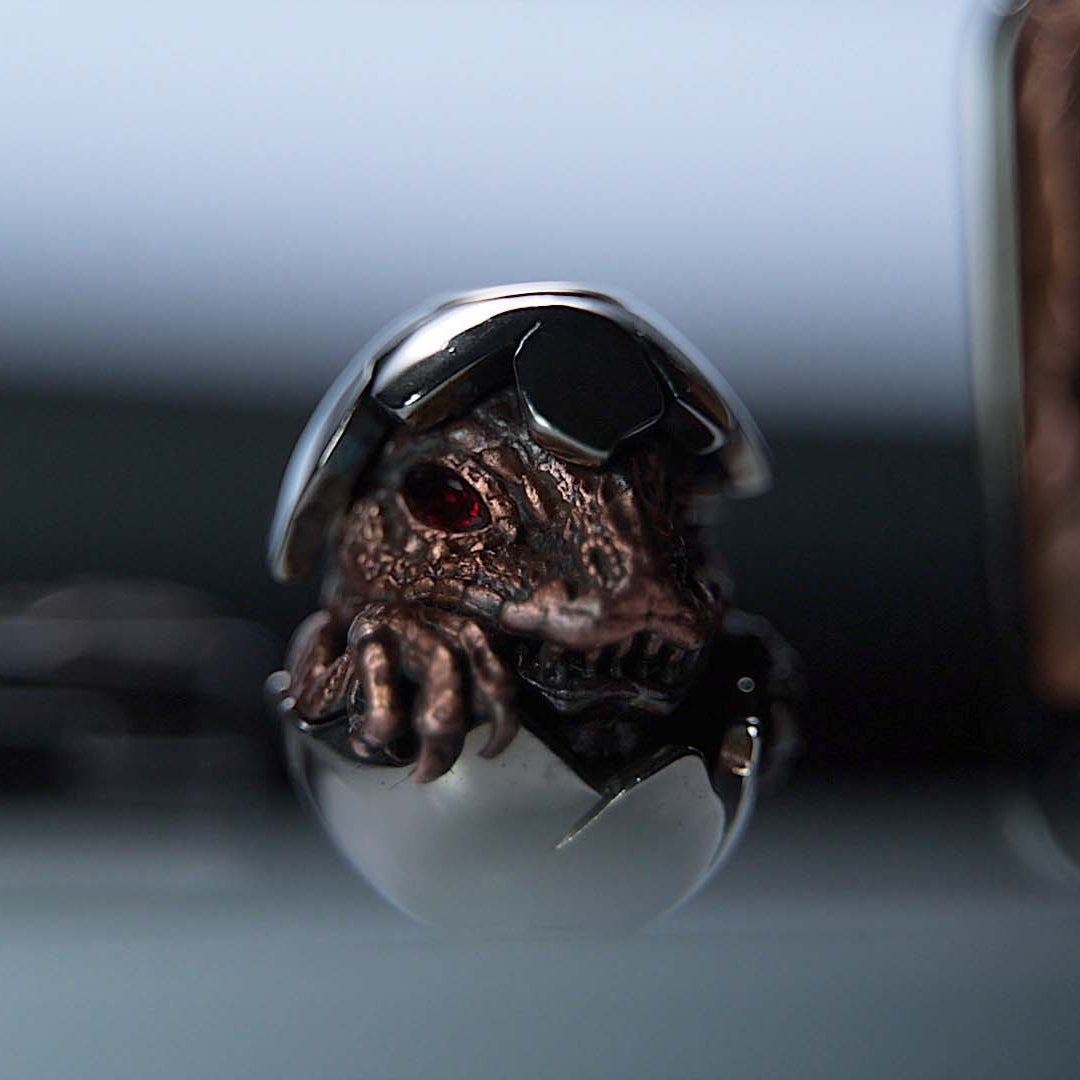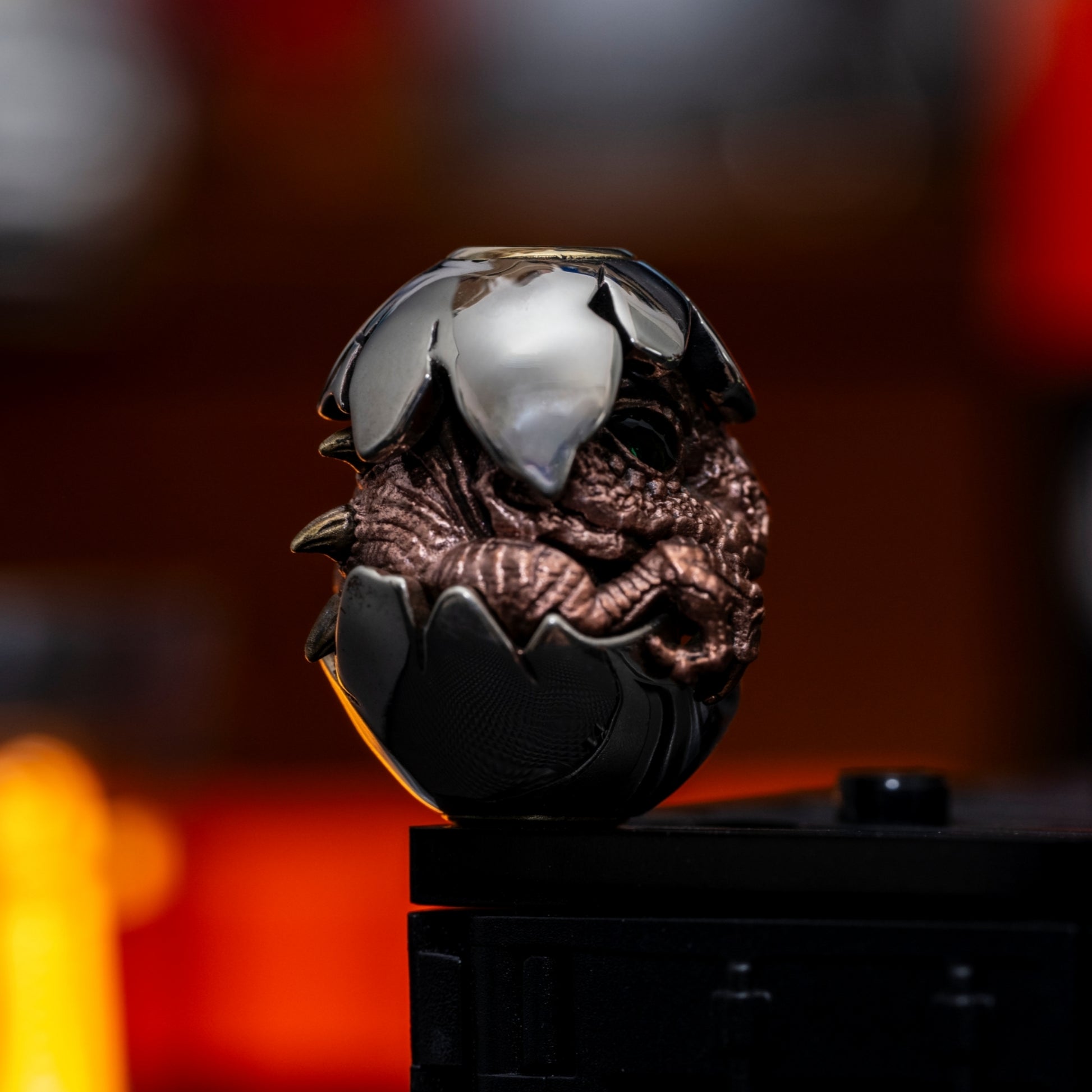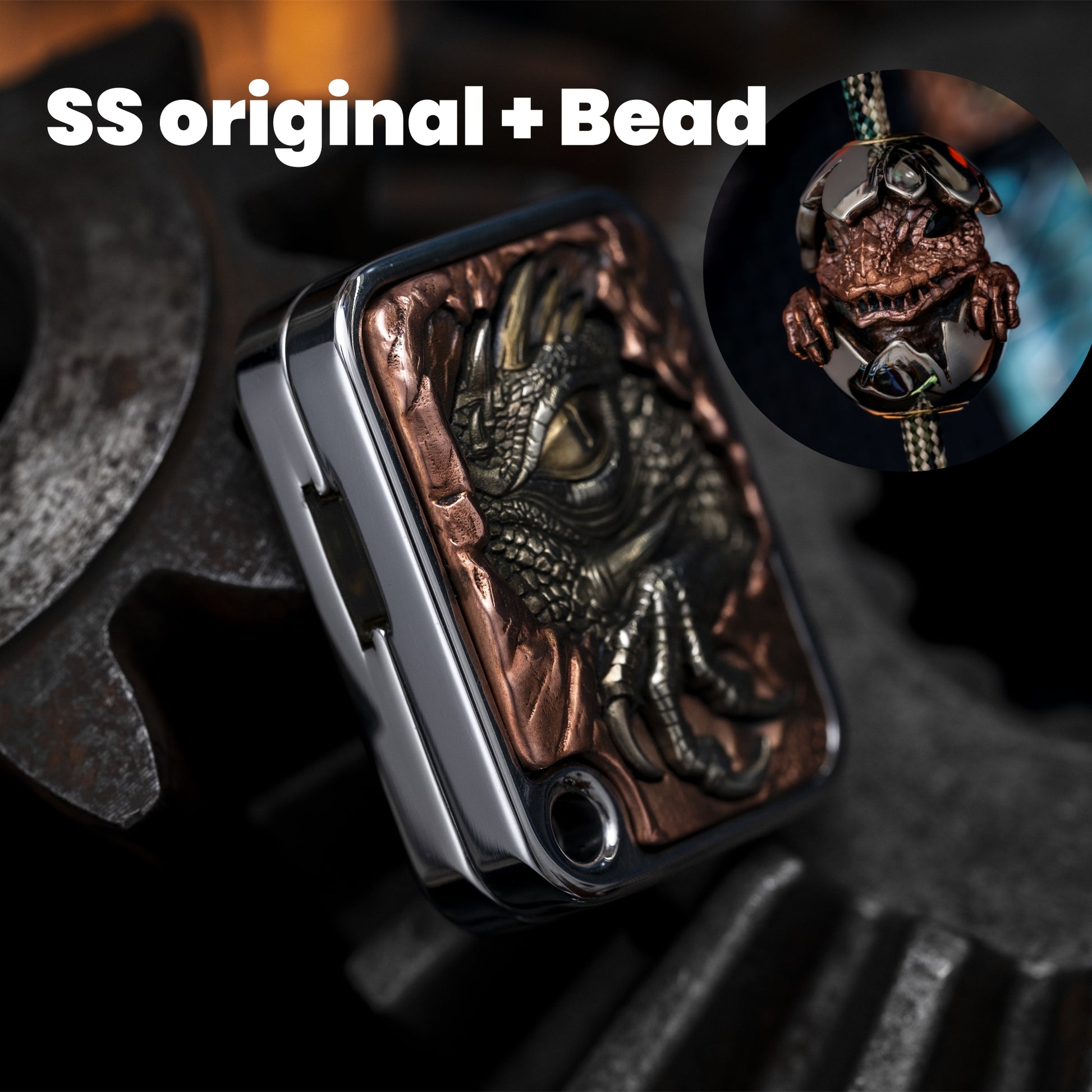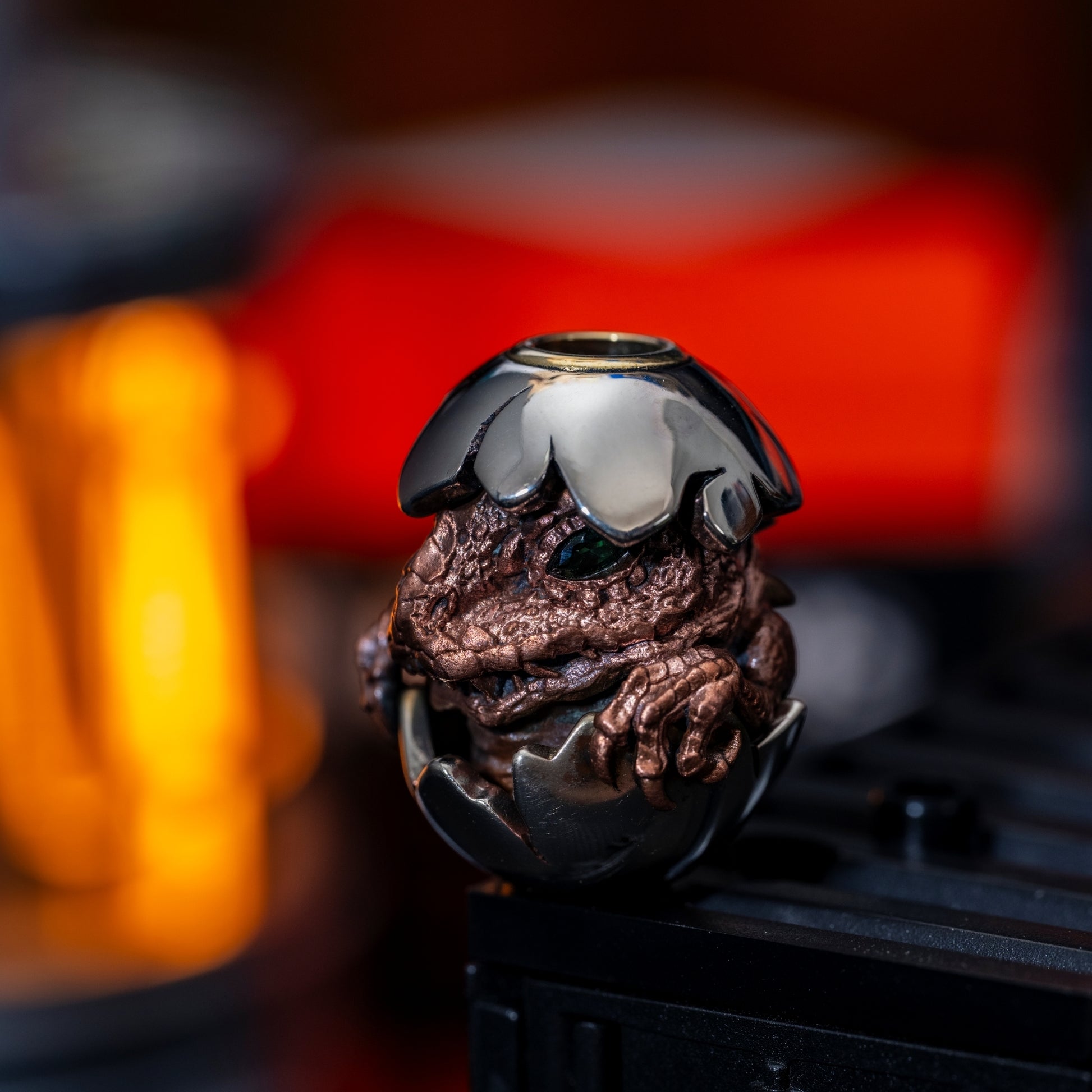 The Dragon Baby bead is a product designed together with the Devil Dragon. Eggshells are made of cupron material. Dragon Baby is made of brass/copper. The eyes are set with ruby. A seemingly simple pendant is made up of 10 parts that are color coded, carved, and inlaid. Dragon Baby hatched from the eggshell, symbolizing the birth of this product. It is recommended to tie the bead under the Devil Dragon slider, which will elevate it to a higher level in both appearance and grip feel.