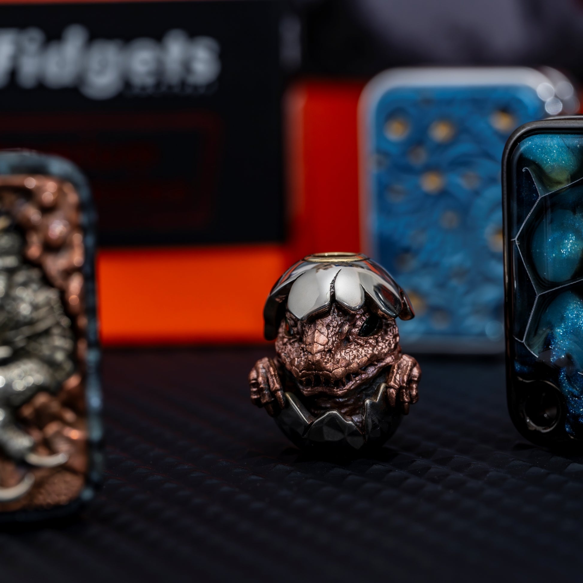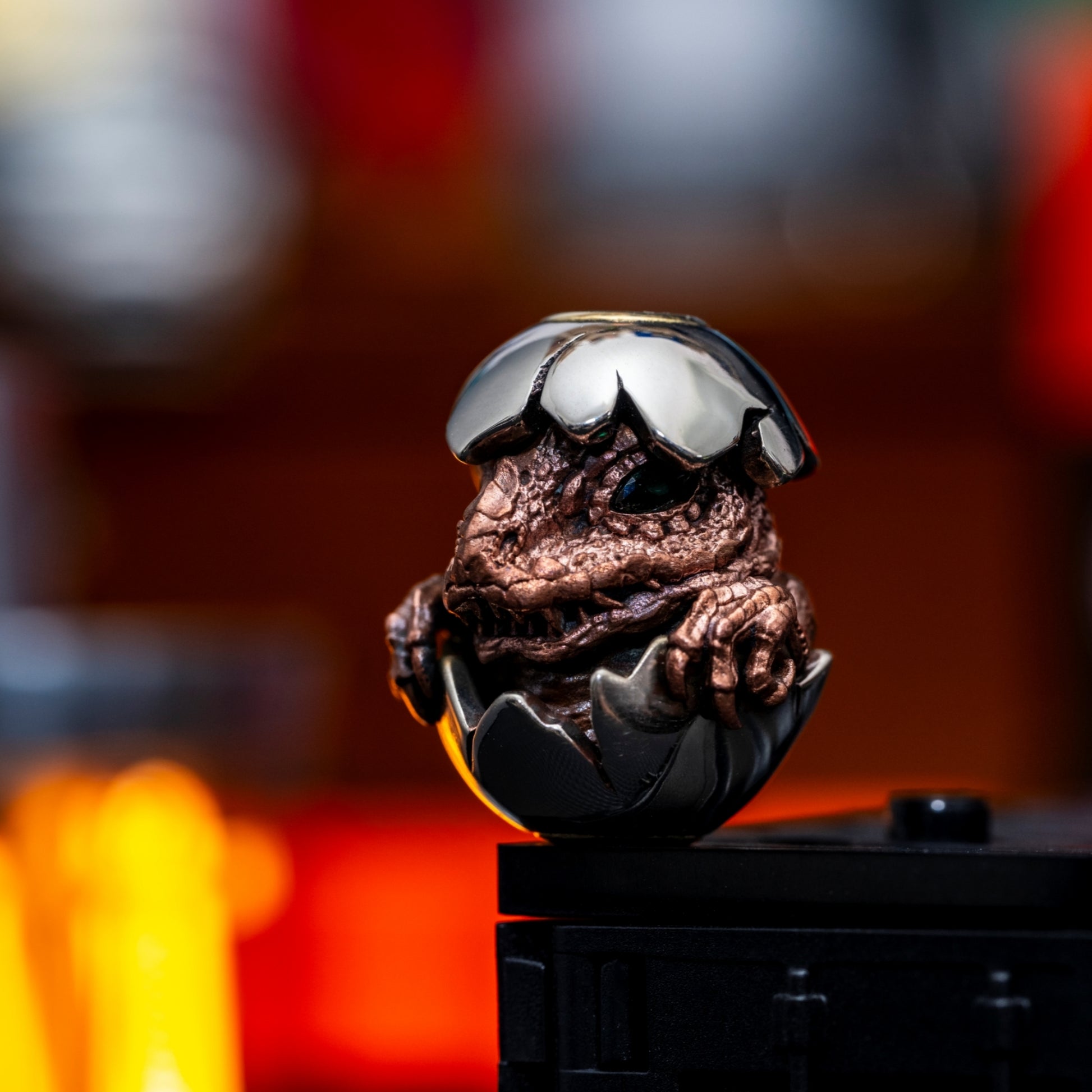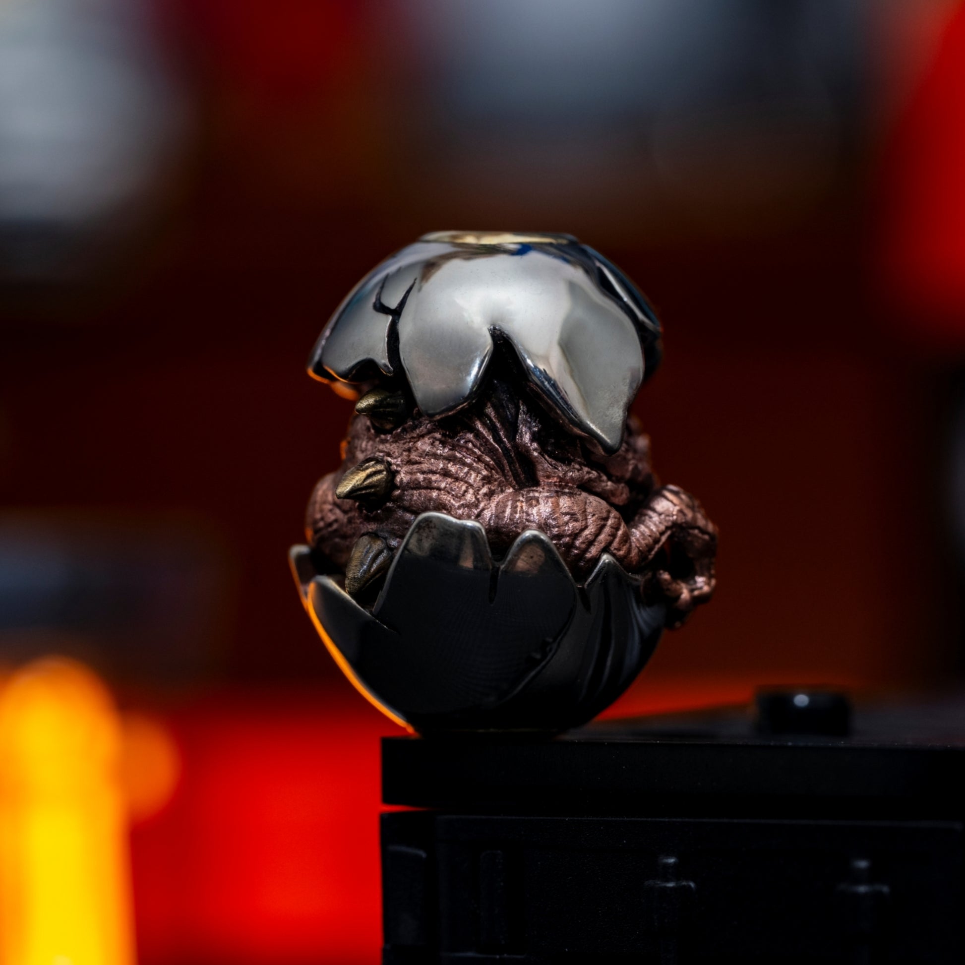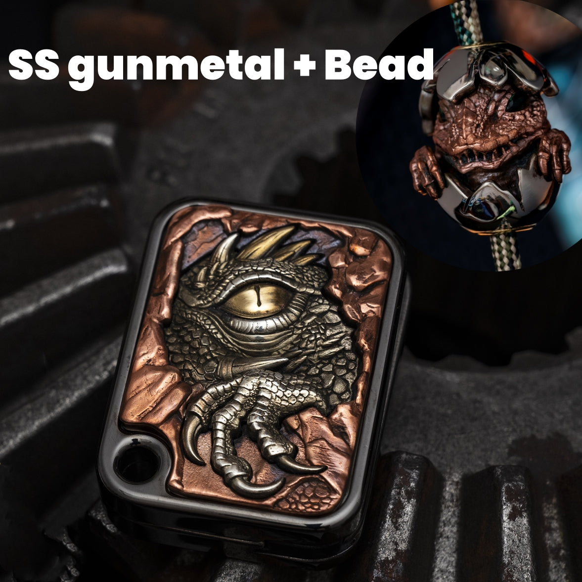 The Dragon Baby bead is a product designed together with the Devil Dragon. Eggshells are made of cupron material. Dragon Baby is made of brass/copper. The eyes are set with ruby. A seemingly simple pendant is made up of 10 parts that are color coded, carved, and inlaid. Dragon Baby hatched from the eggshell, symbolizing the birth of this product. It is recommended to tie the bead under the Devil Dragon slider, which will elevate it to a higher level in both appearance and grip feel.