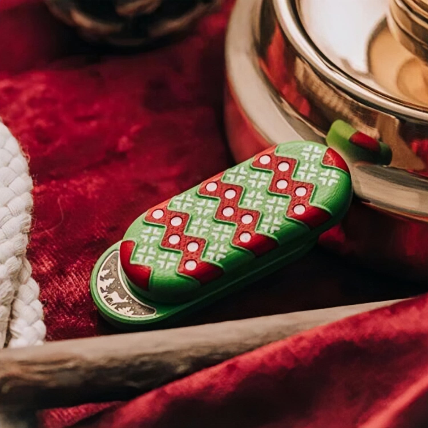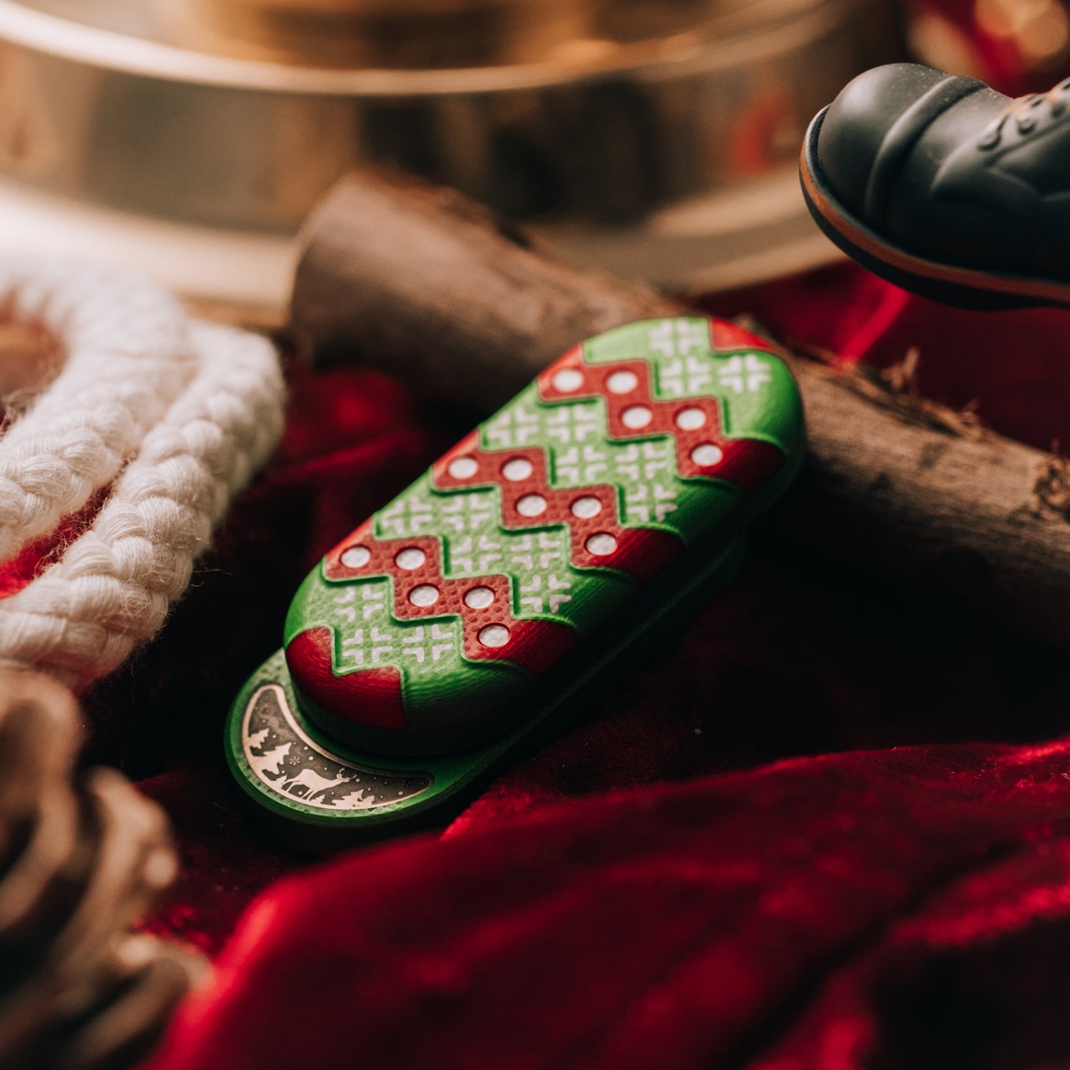 Inside the base, DZ combined brass inlays with laser engraving. Understanding that collectors value unique serial numbers, even on non-metallic pieces, DZ integrated this detail into the internal structure (since G10 doesn't take laser well). This clever design also highlights the luxurious golden tones of brass, enhancing the festive Christmas color scheme.