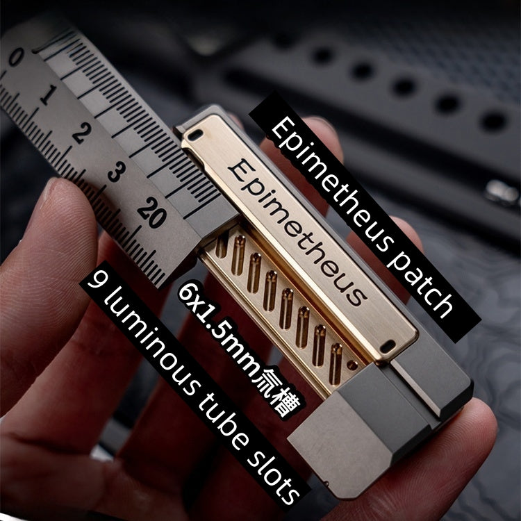 After pushing open the slider, you can see 9 luminous tube slots with a size of 1.5 * 6mm. The front is engraved with Epimetheus. I guess it's a foolish god. The back is engraved with the names of two studios.