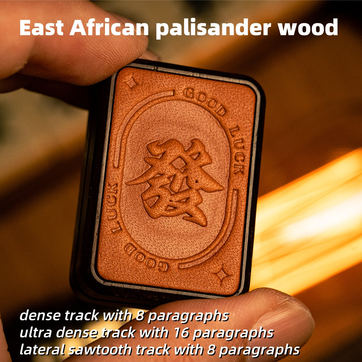 "發", pronounced as Fa, the Chinese meaning is "Rich". The material is East African palisander wood. The three types of internal tracks are: dense track with 8 paragraphs, ultra dense track with 16 paragraphs, and lateral sawtooth track with 8 paragraphs.