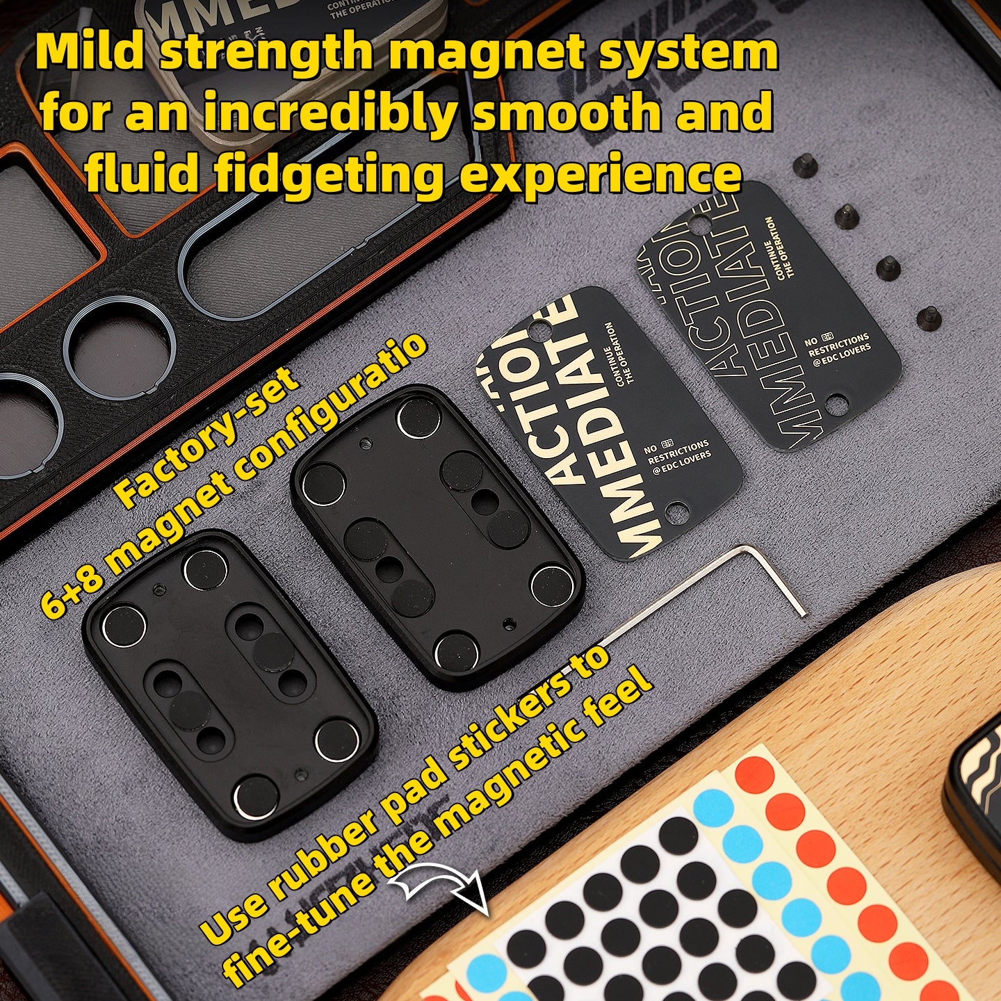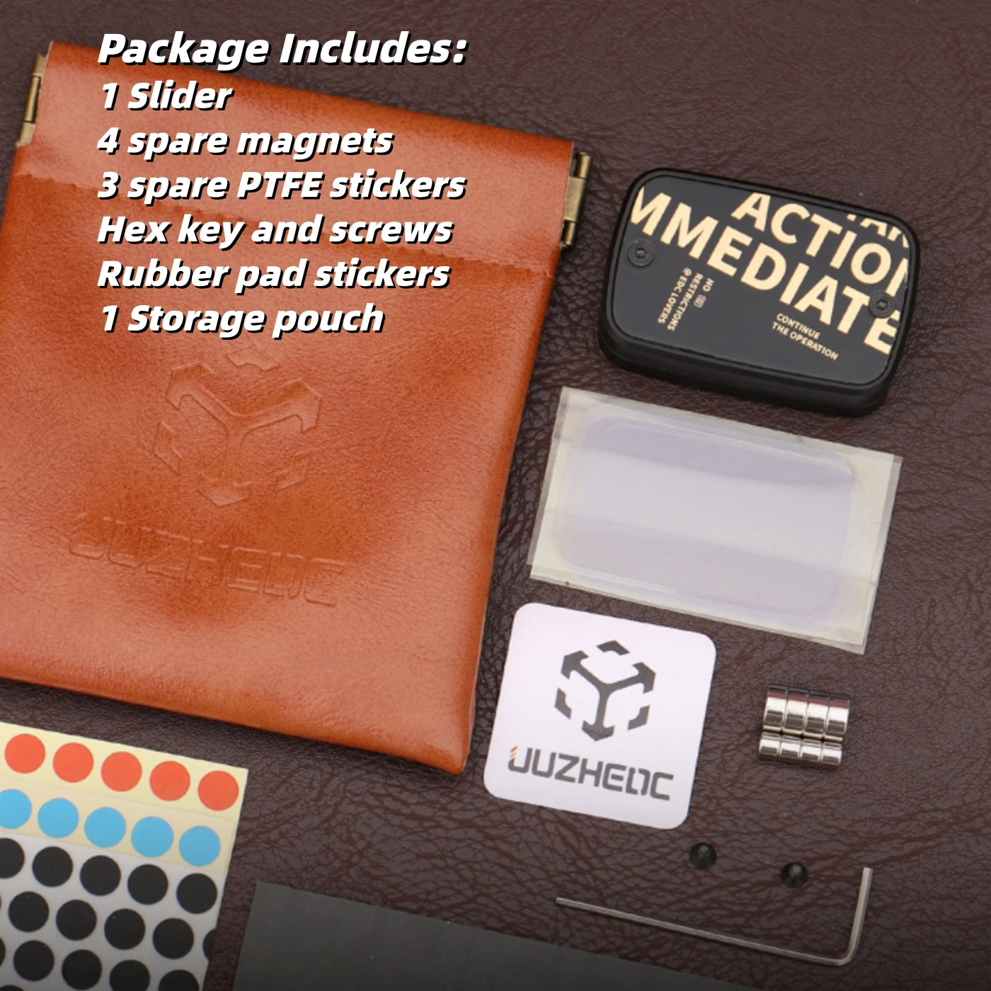 The slider is constructed entirely from aluminum alloy. It features a factory-set 6+8 magnet configuration, suitable for most trick styles. You can also reconfigure it to a 6+6 or 8+8 layout according to your preference. The magnetic system is tuned to a mild strength for an incredibly smooth and fluid fidgeting experience. Rubber pad stickers are included, allowing you to fine-tune the magnetic feel to your liking.