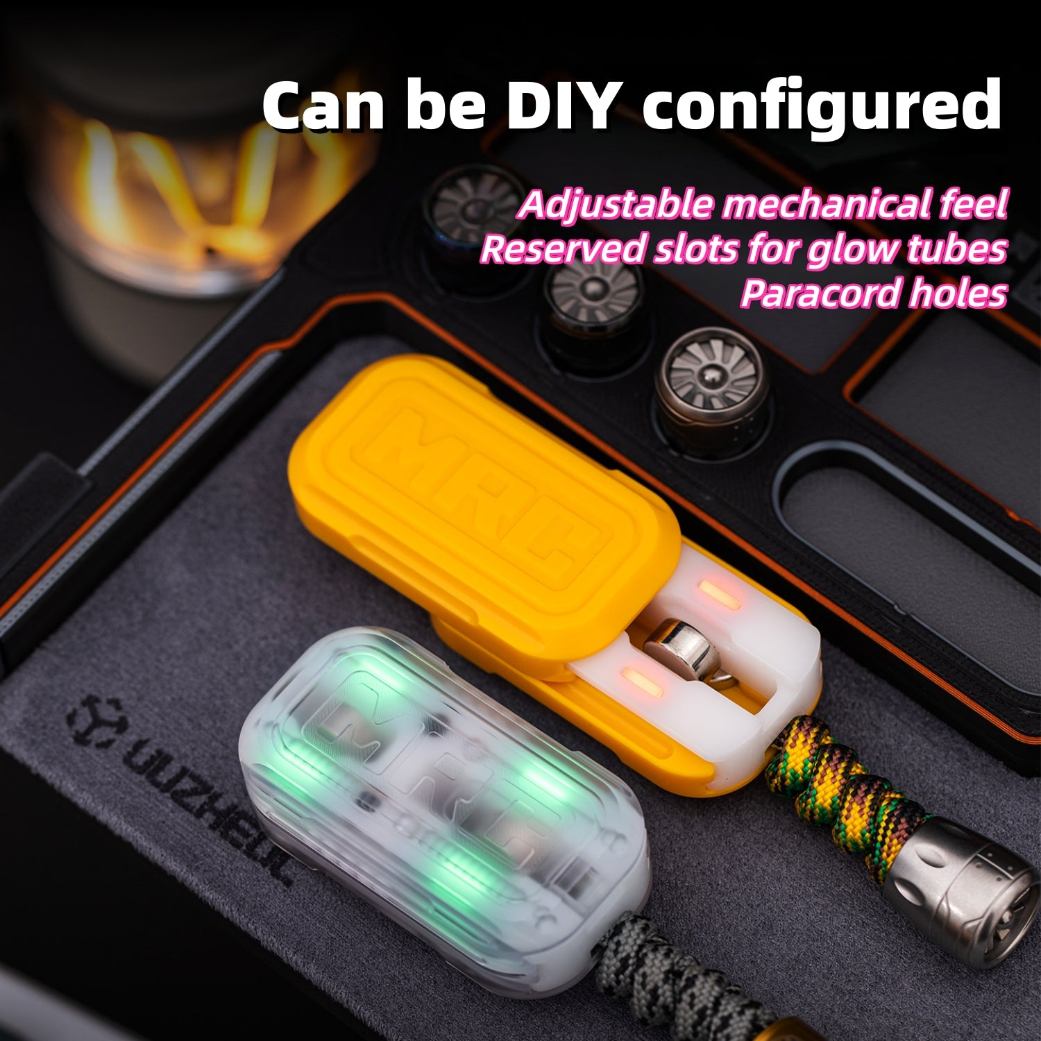 Reserve spaces for DIY. Different beads are included, which can be used to adjust the mechanical feel. You can also adjust it to a purely mechanical slider or a purely magnetic slider. There are reserved slots for glow tubes and hole for paracord, allowing you to create your own exclusive toy.