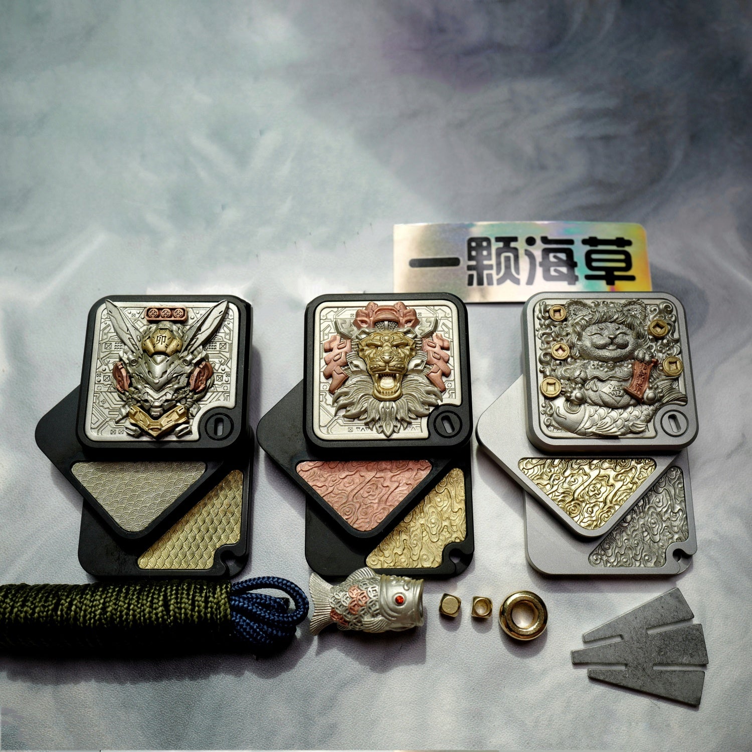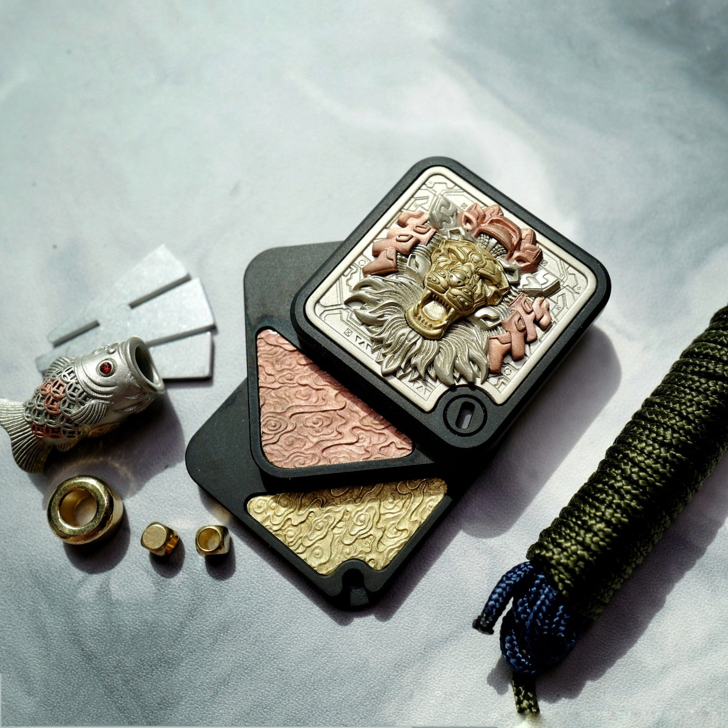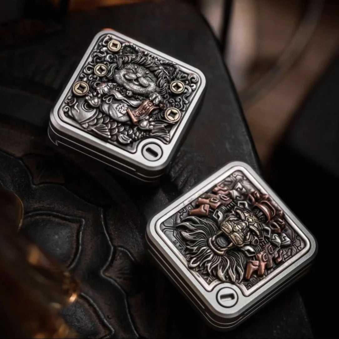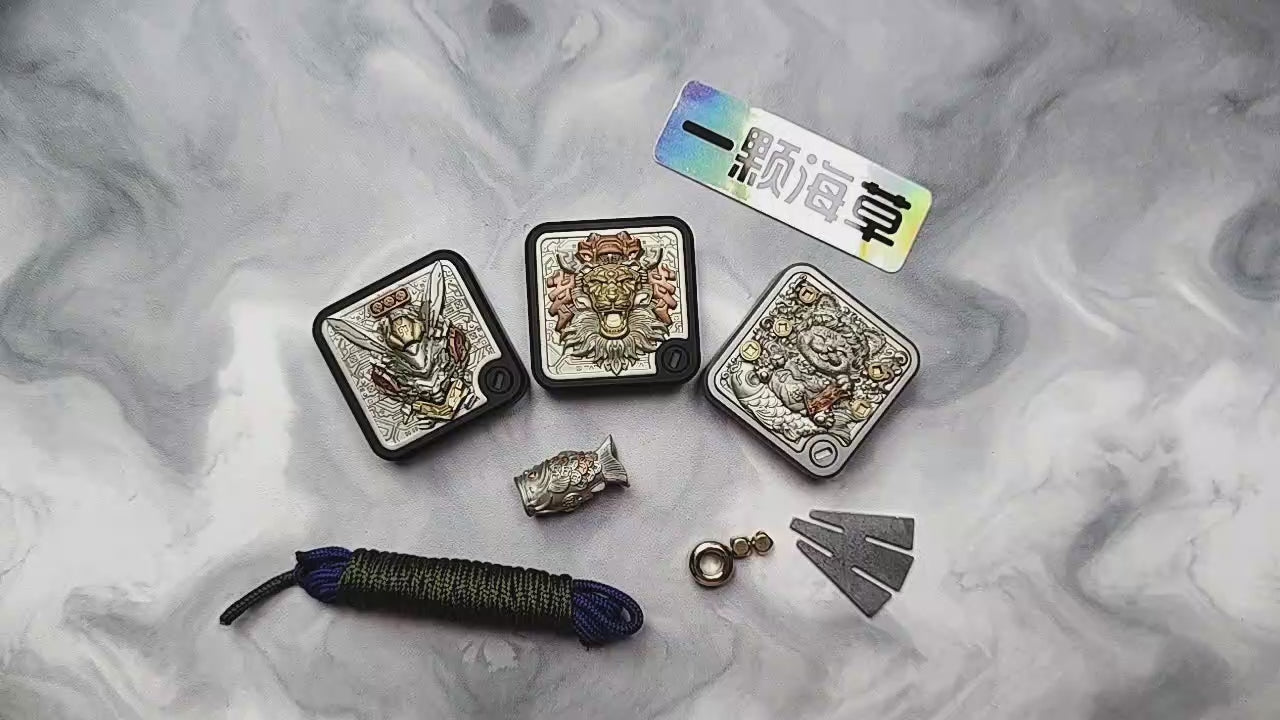 The main body is made of stainless steel, with black plating or sandblasting processes. There are a total of twelve beautifully carved patches for decoration. The material of the patches is a mixture of Cupron, copper and brass. The main patch in the front is attached to the main body through magnets. In the future, other replaceable main patches will be introduced.