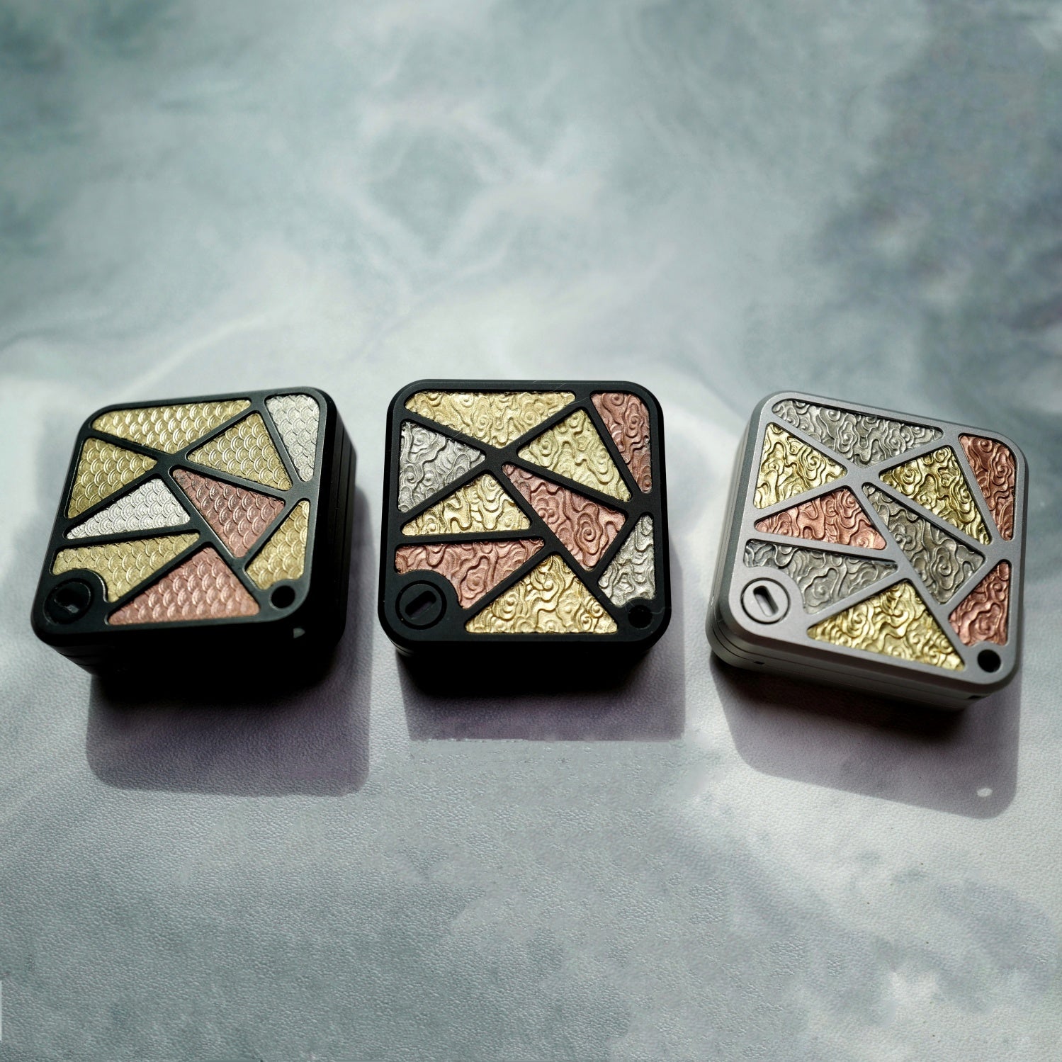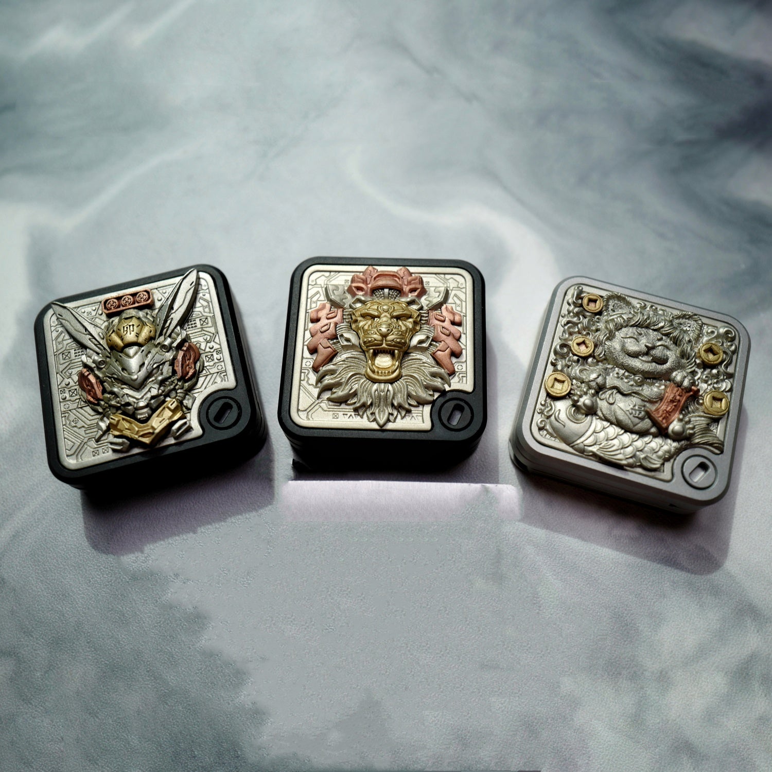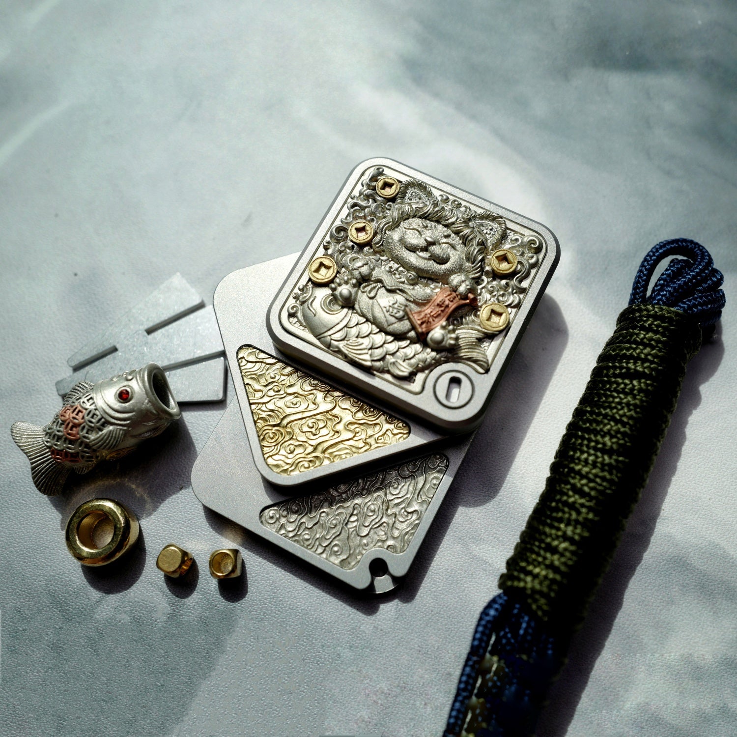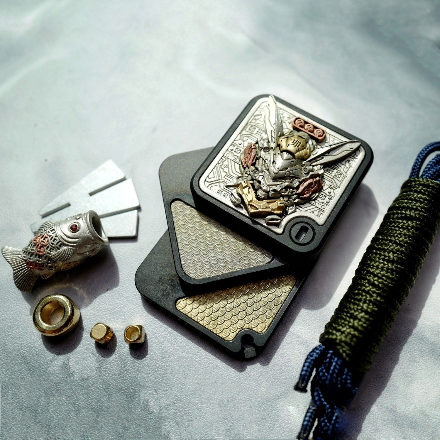 The main body is made of stainless steel, with black plating or sandblasting processes. There are a total of twelve beautifully carved patches for decoration. The material of the patches is a mixture of Cupron, copper and brass. The main patch in the front is attached to the main body through magnets. In the future, other replaceable main patches will be introduced.