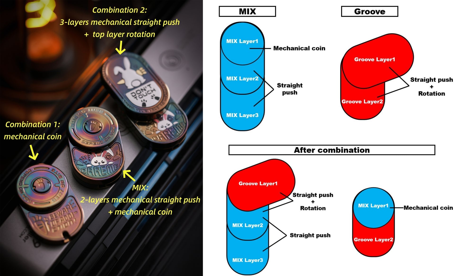 MOT has retained the straight push function of the Groove and moved the rotation function to the newly added third layer. The newly designed third layer internal structure can achieve a multi touch ratchet coin gameplay. Compared to Groove, MIX has a more compact overall feel.