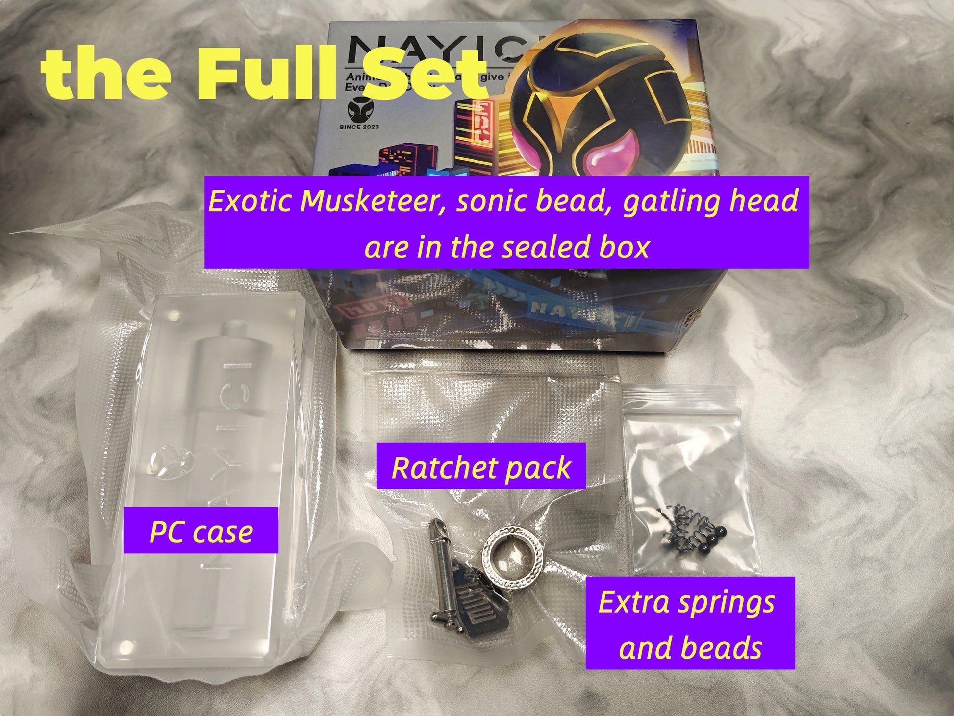 The musketeer, sonic bead, and gatling head have been assembled together and sealed in the paper box. Ratchet pack and PC case are packaged separately.