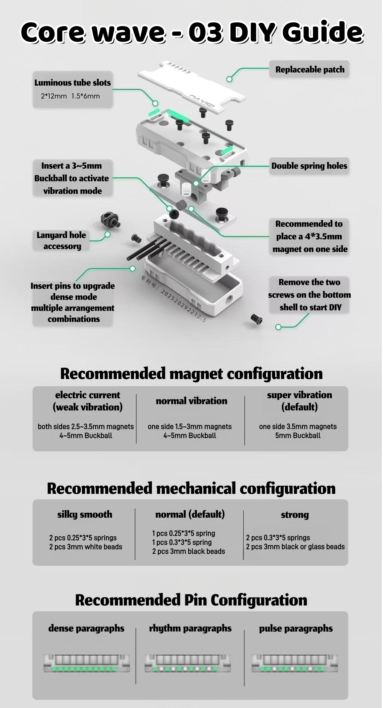 It has rich DIY gameplay. You can configure it as mechanical+magnetic mode, pure mechanical mode, pure magnetic mode. There are abundant spare parts in the accessory kit for you to dispose of. The factory default mode is 10 paragraphs. After inserting the pins, upgrade it to 20 paragraphs. Feeling more dense and crispy. The magnetic patch can be replaced in the future. There are three luminous tube slots in total. You can insert 1 pcs 2*12mm and 2 pcs 1.5*6mm luminous tubes. No need for glue.