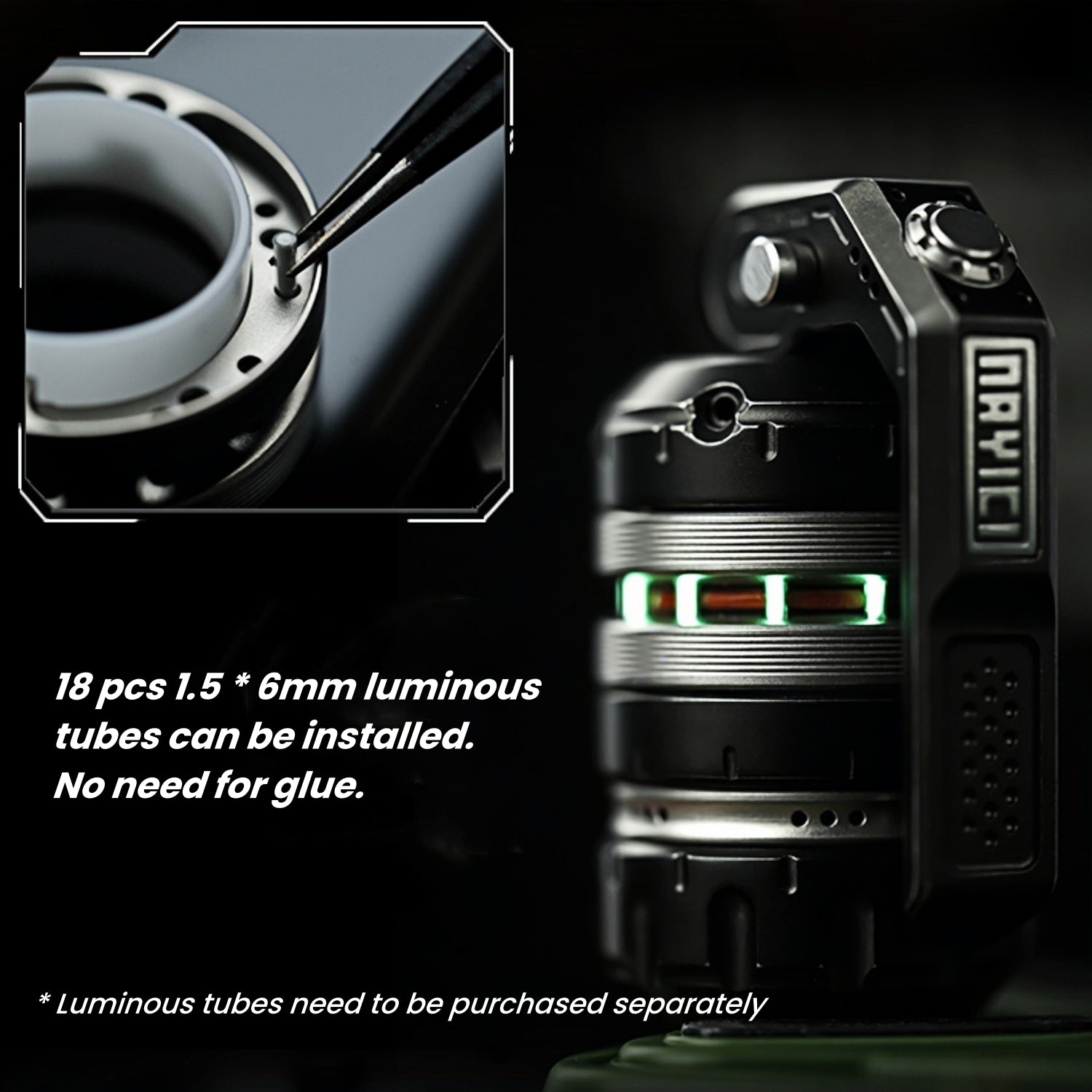 For Ti version, 18 pcs 1.5*6mm luminous tubes can be installed. No need for glue. Luminous tubes need to be purchased separately.