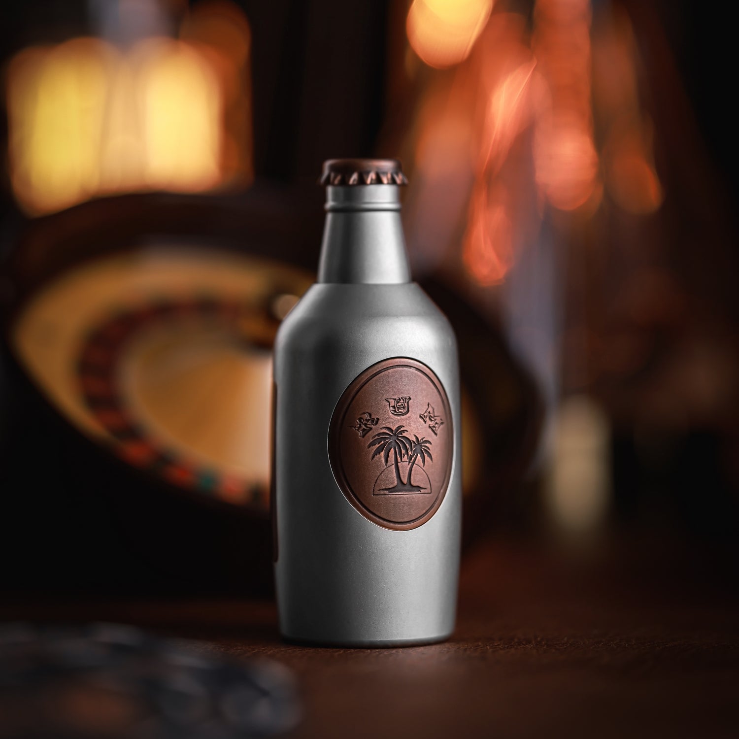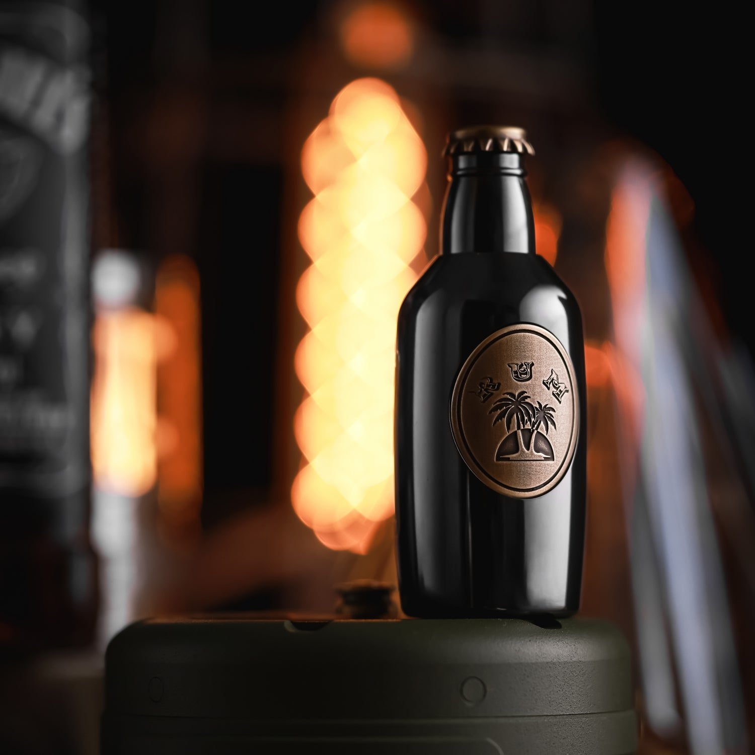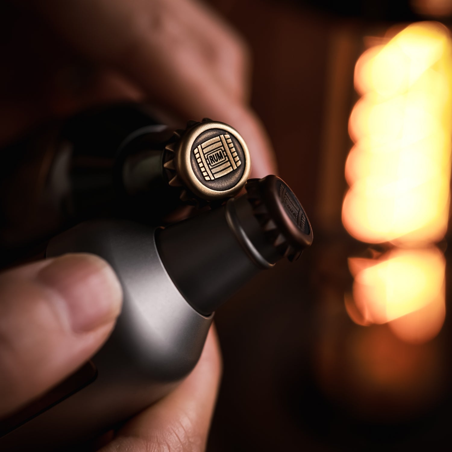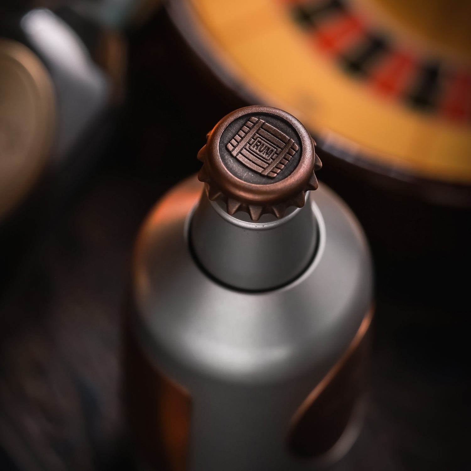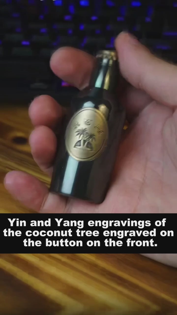 The surface is distressed by laser engraving. The gradient "RUM" on the front is matched with coconut trees, and the yin and yang carvings highlight the three-dimensional contrast. On the back is the brand Logo. A small wine barrel is carved above the cap.