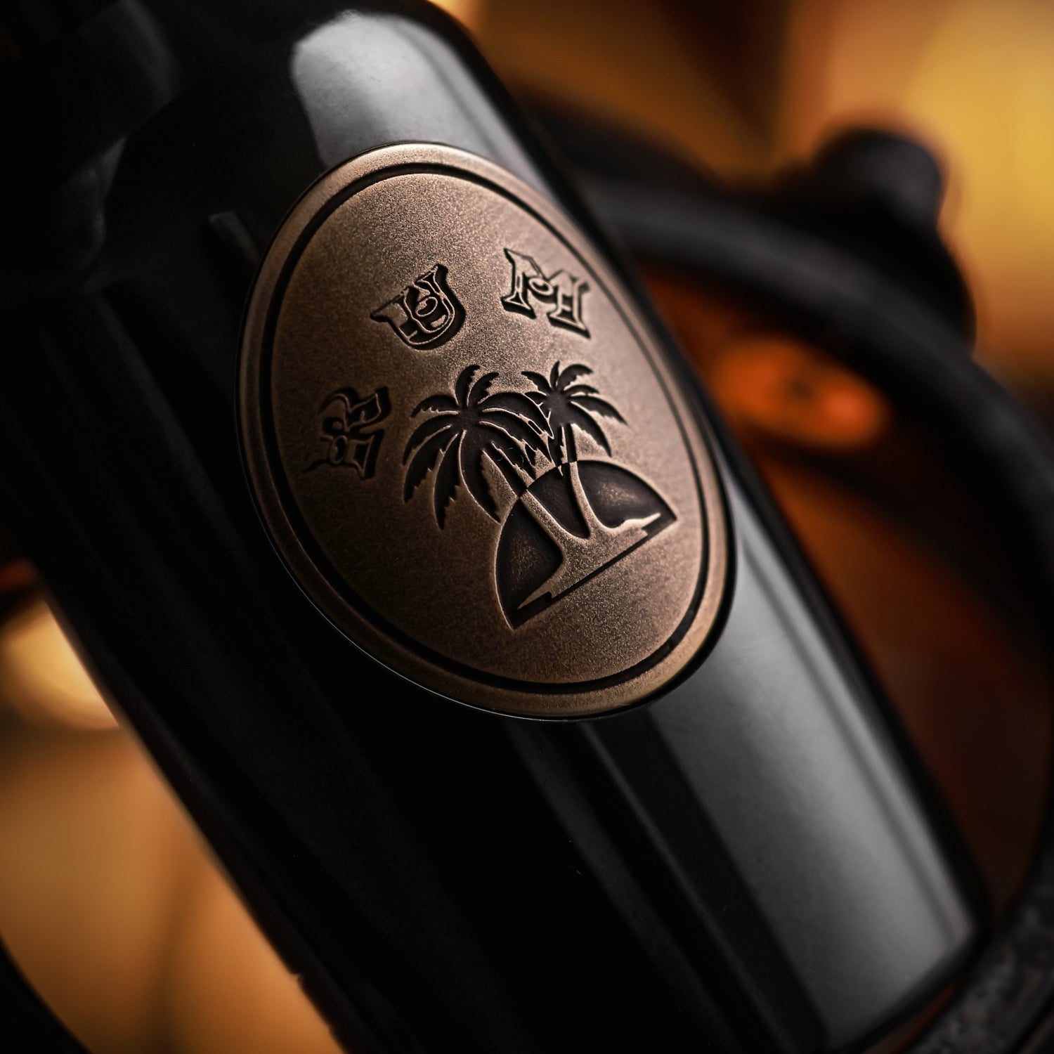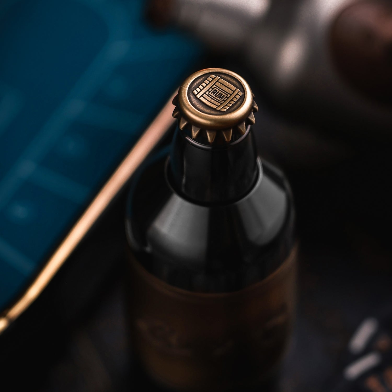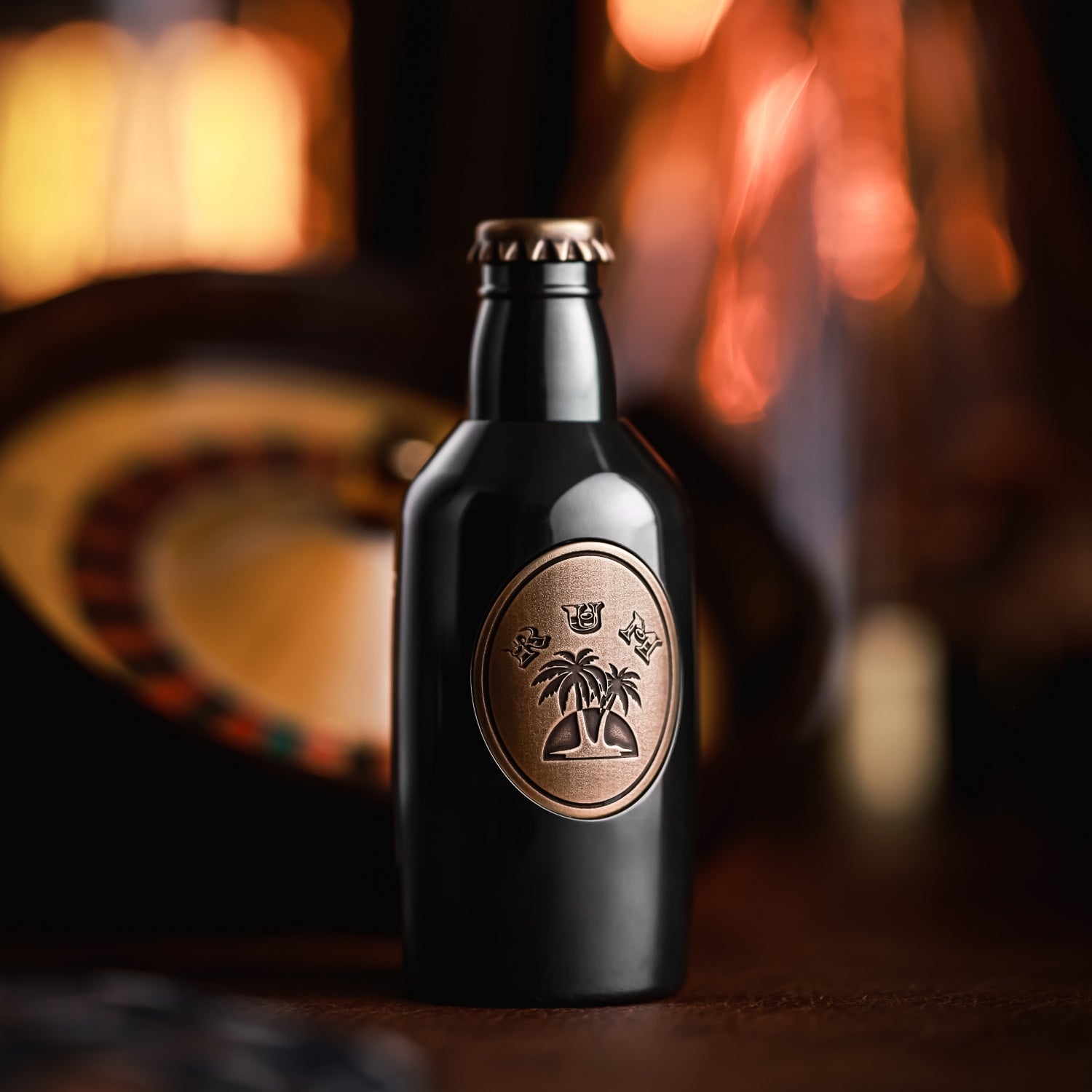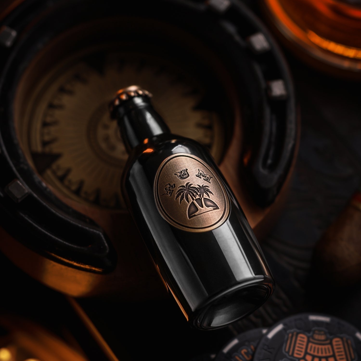 The surface is distressed by laser engraving. The gradient "RUM" on the front is matched with coconut trees, and the yin and yang carvings highlight the three-dimensional contrast. On the back is the brand Logo. A small wine barrel is carved above the cap.