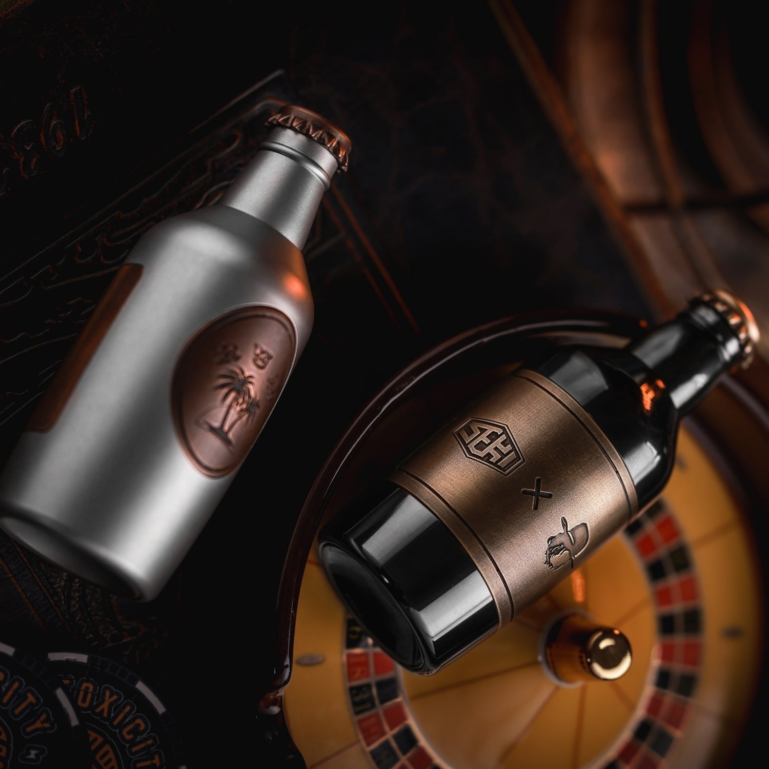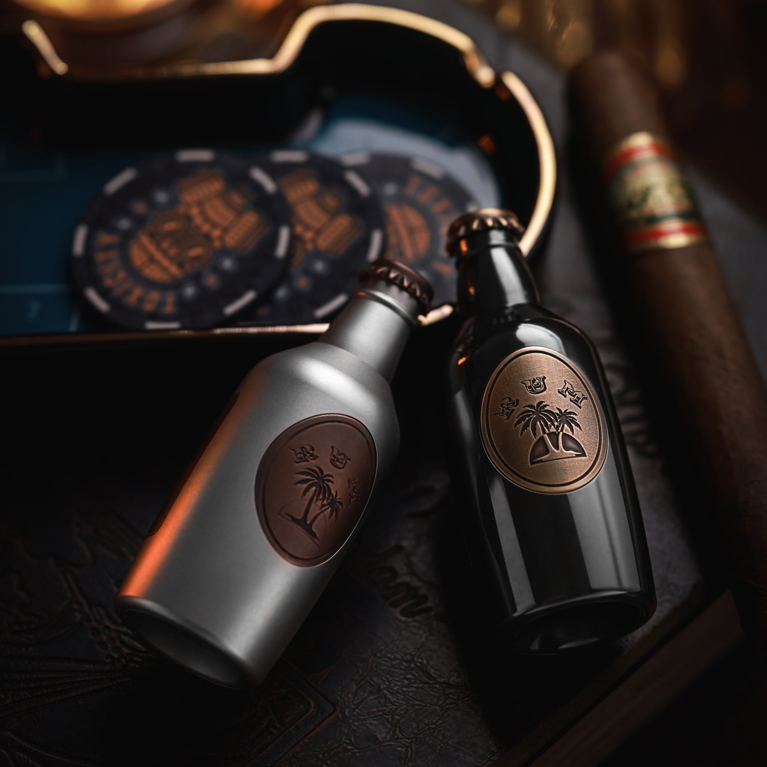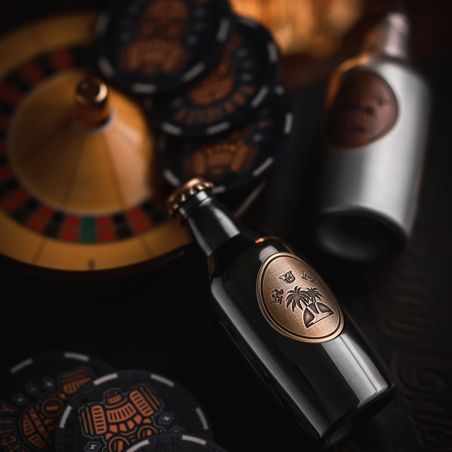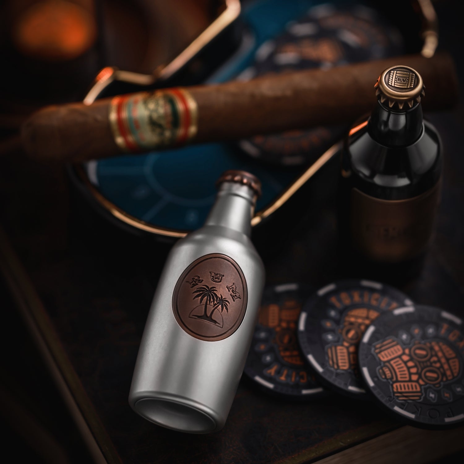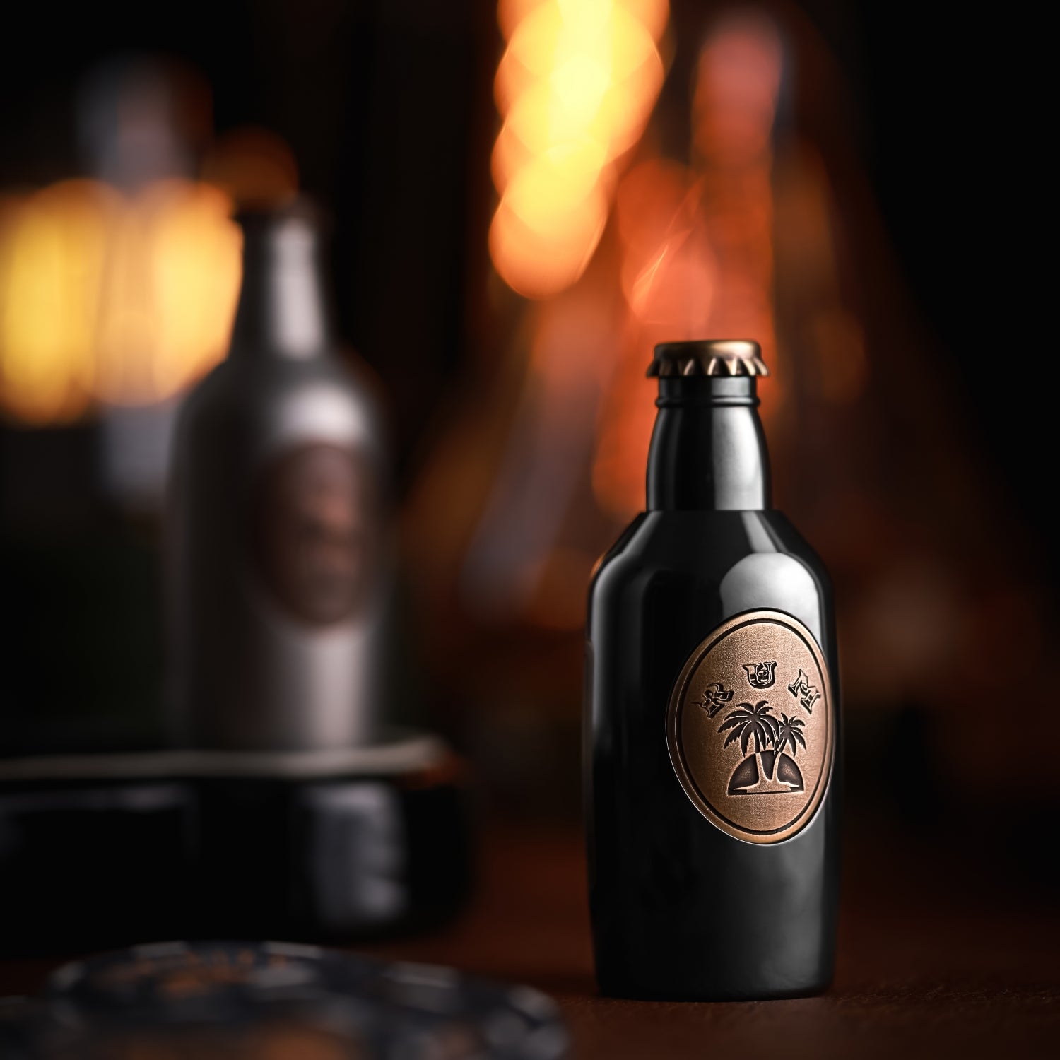 The surface is distressed by laser engraving. The gradient "RUM" on the front is matched with coconut trees, and the yin and yang carvings highlight the three-dimensional contrast. On the back is the brand Logo. A small wine barrel is carved above the cap.