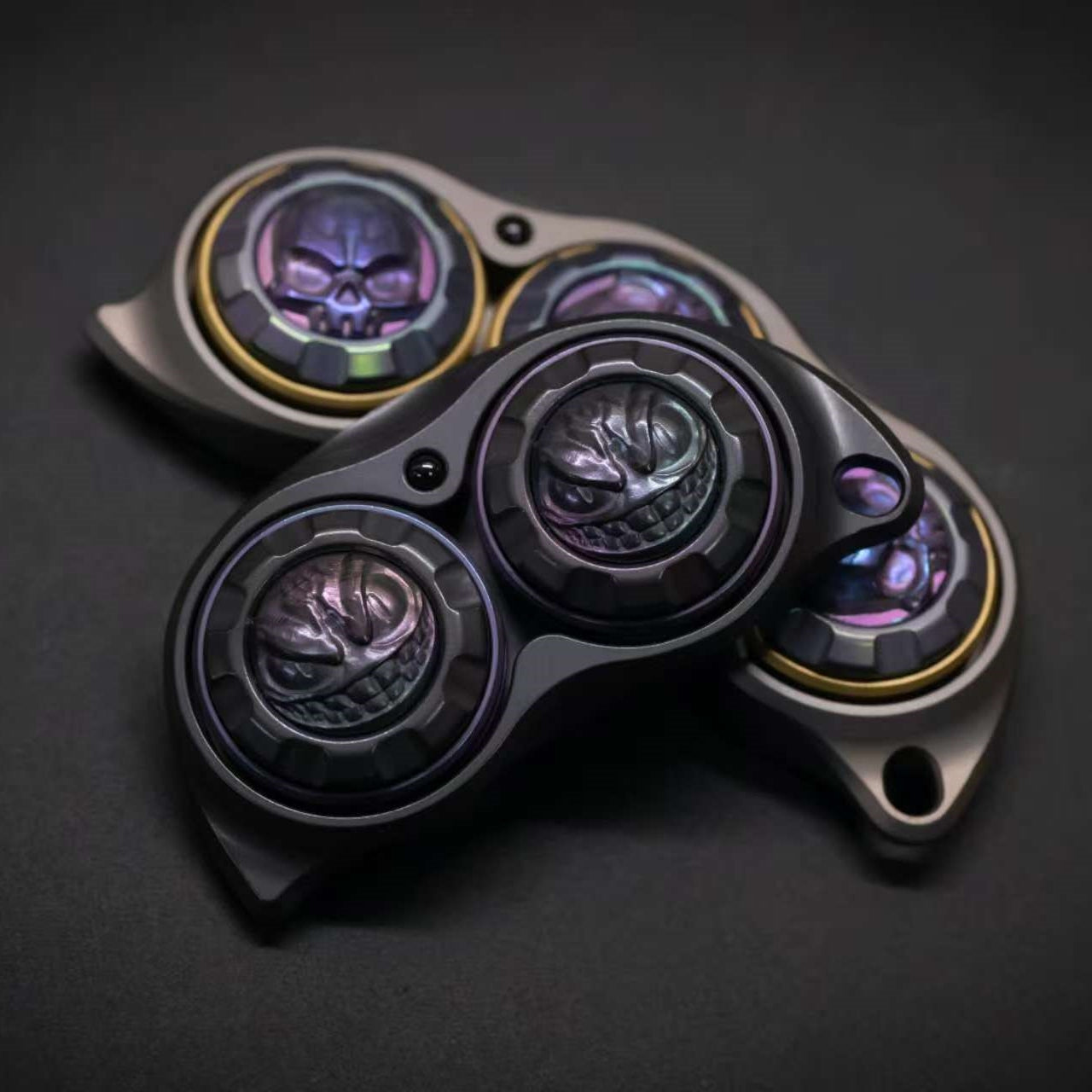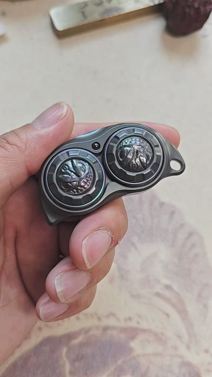 Mini version of Pea Pods, the pod body and three embossed peas are made of zirc, pearl stone washed then flamed color. The slider on the back is Ti anodized.