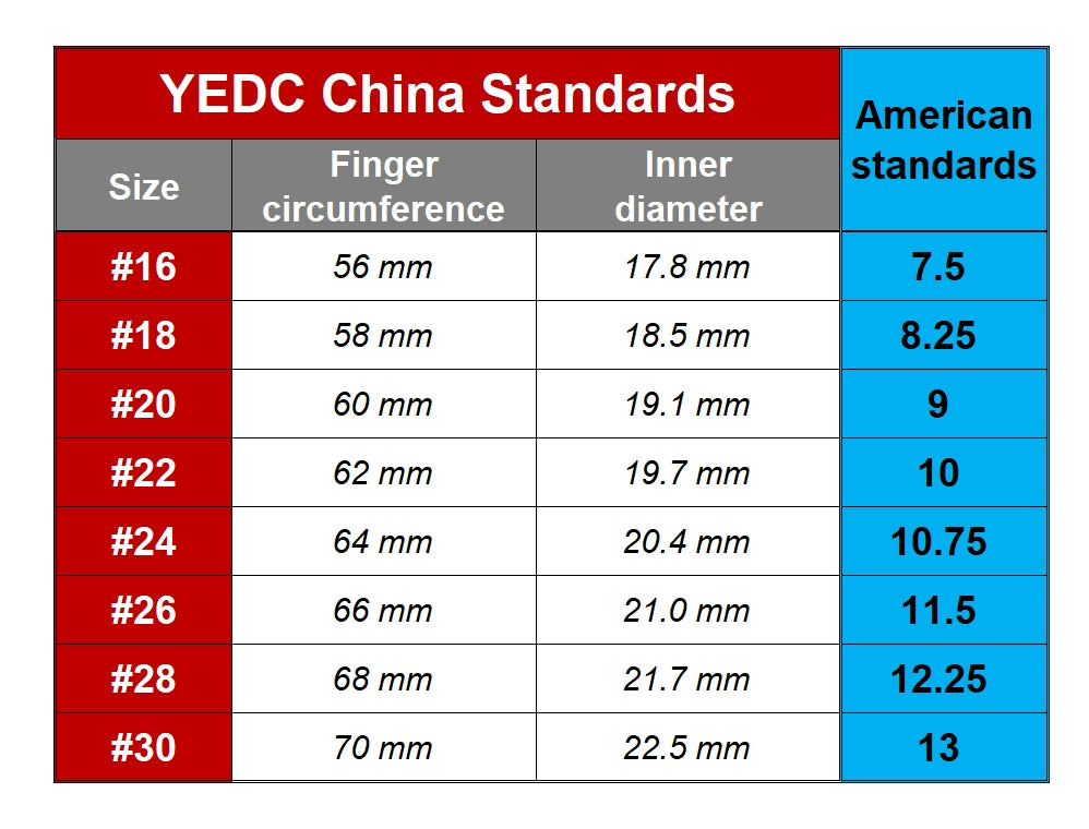 YEDC offers 8 sizes from #16 to #30 to choose from. This size is according to Chinese standards. Please refer to the image for the diameter and circumference of each size, as well as the corresponding US standard sizes.