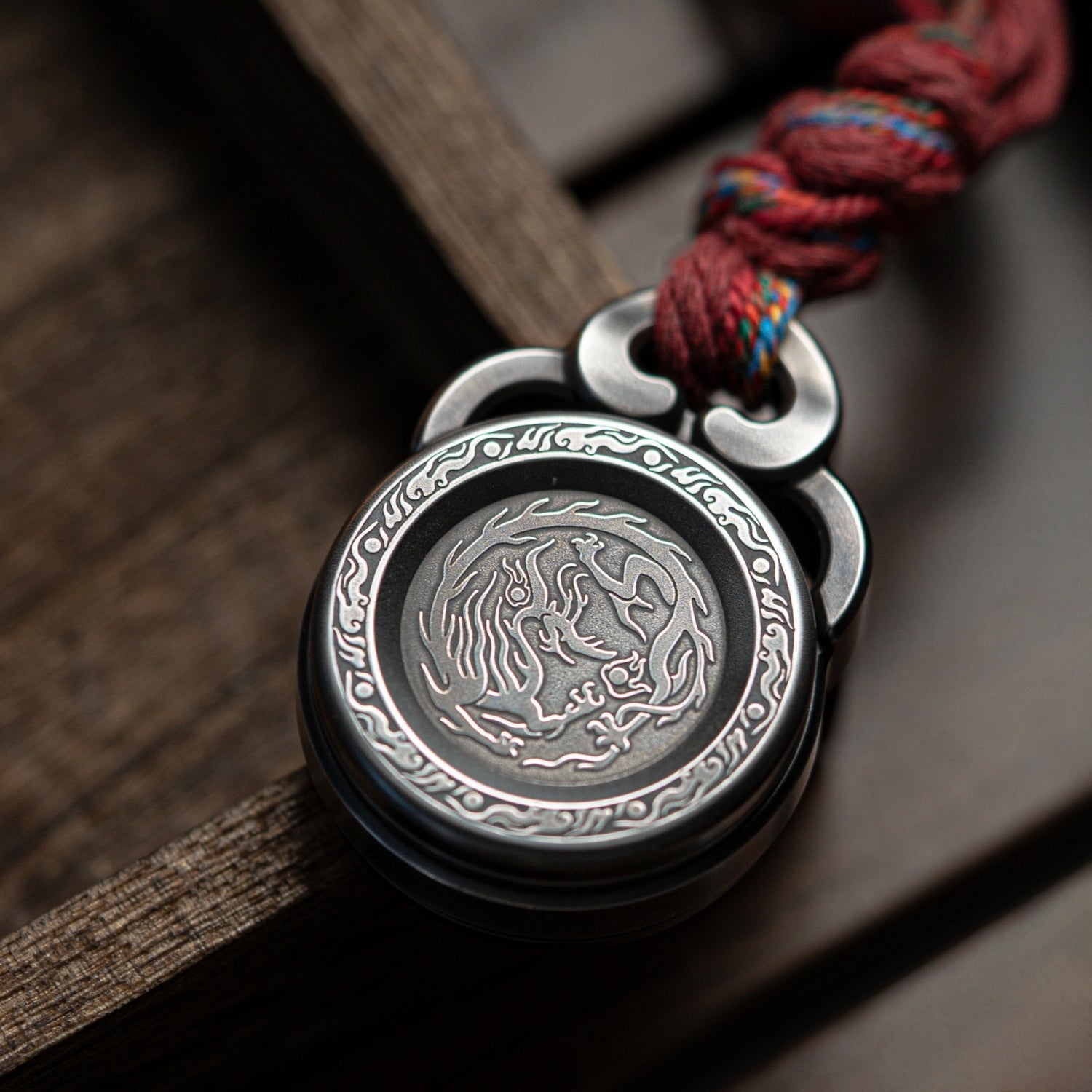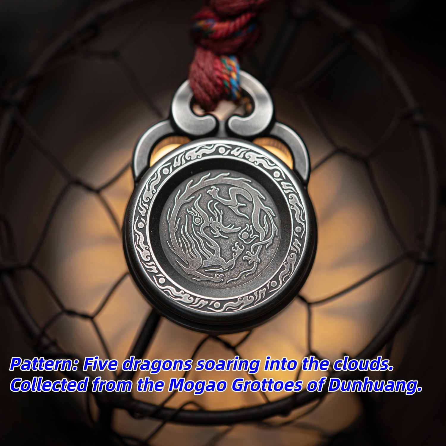 The material is stainless steel with a stone-washed and aged finish. The pattern on the side of the mechanical haptic is "Five dragons soaring into the clouds", which was collected from the Mogao Grottoes of Dunhuang. The pattern on the side of the magnetic haptic is "Double Clouds Bringing Auspiciousness".