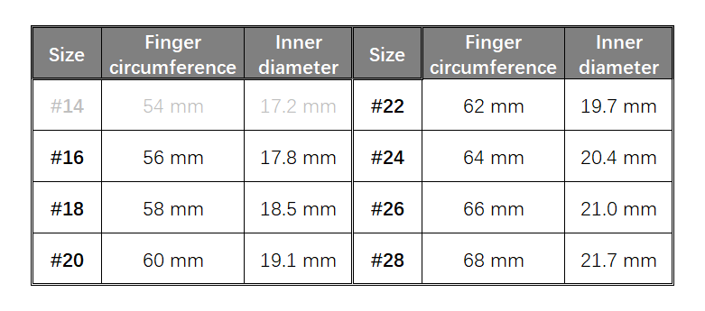 - Size #28 : Finger circumference 68 mm, Inner diameter 21.7 mm