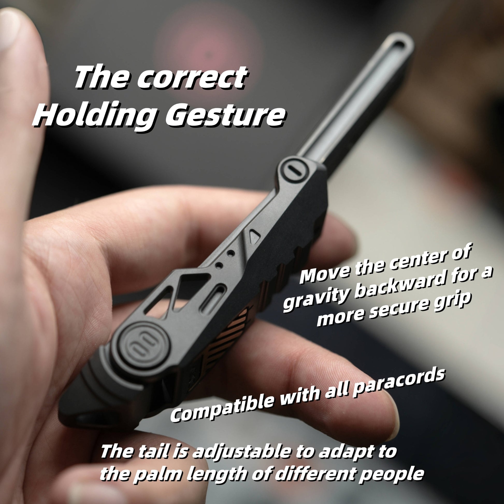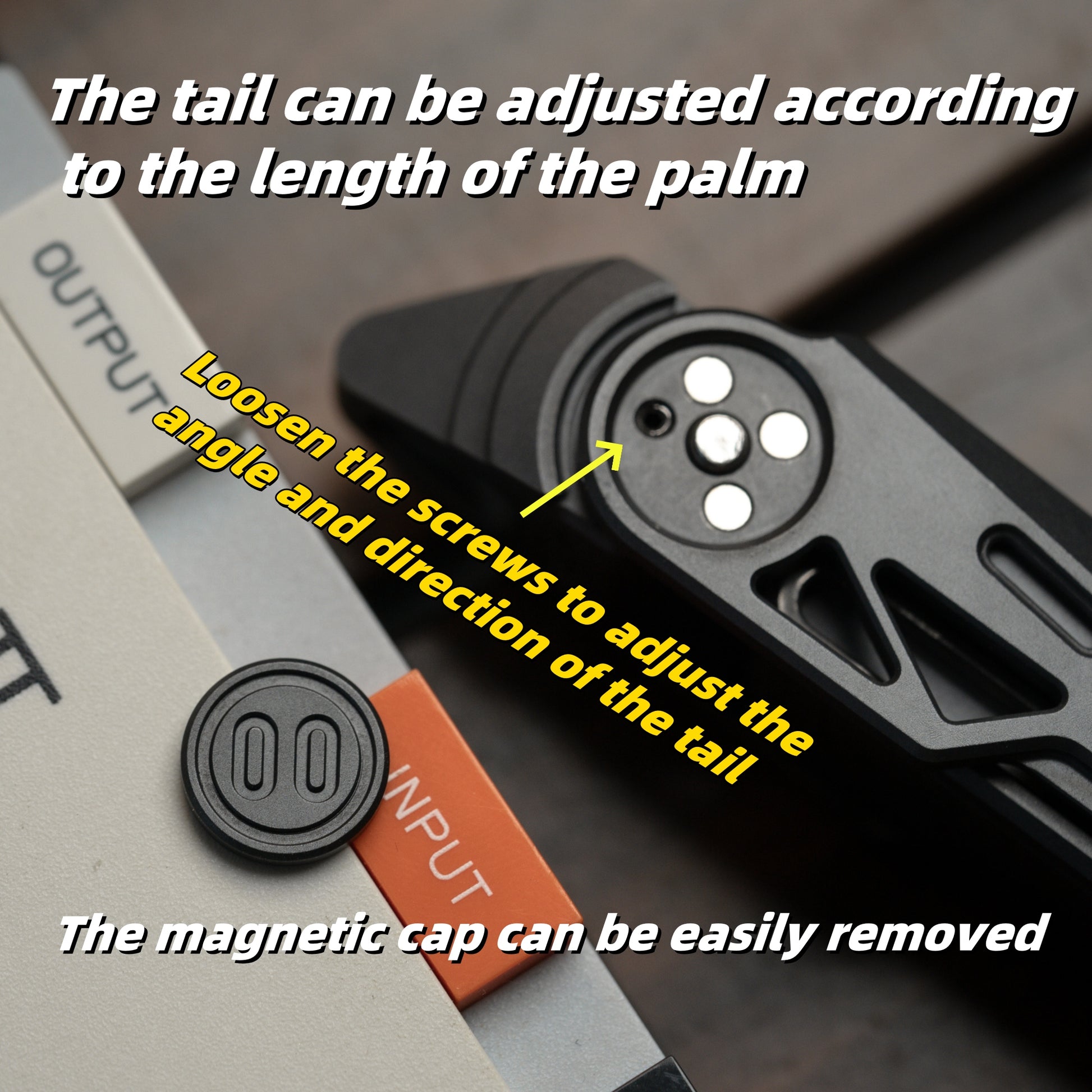 The tail can be adjusted according to the length of the palm. The magnetic cap can be easily removed. Then you can loosen the screws to adjust the angle and direction of the tail. The paracord hole on the tail is very large, and you can match all kinds of paracords and beads.