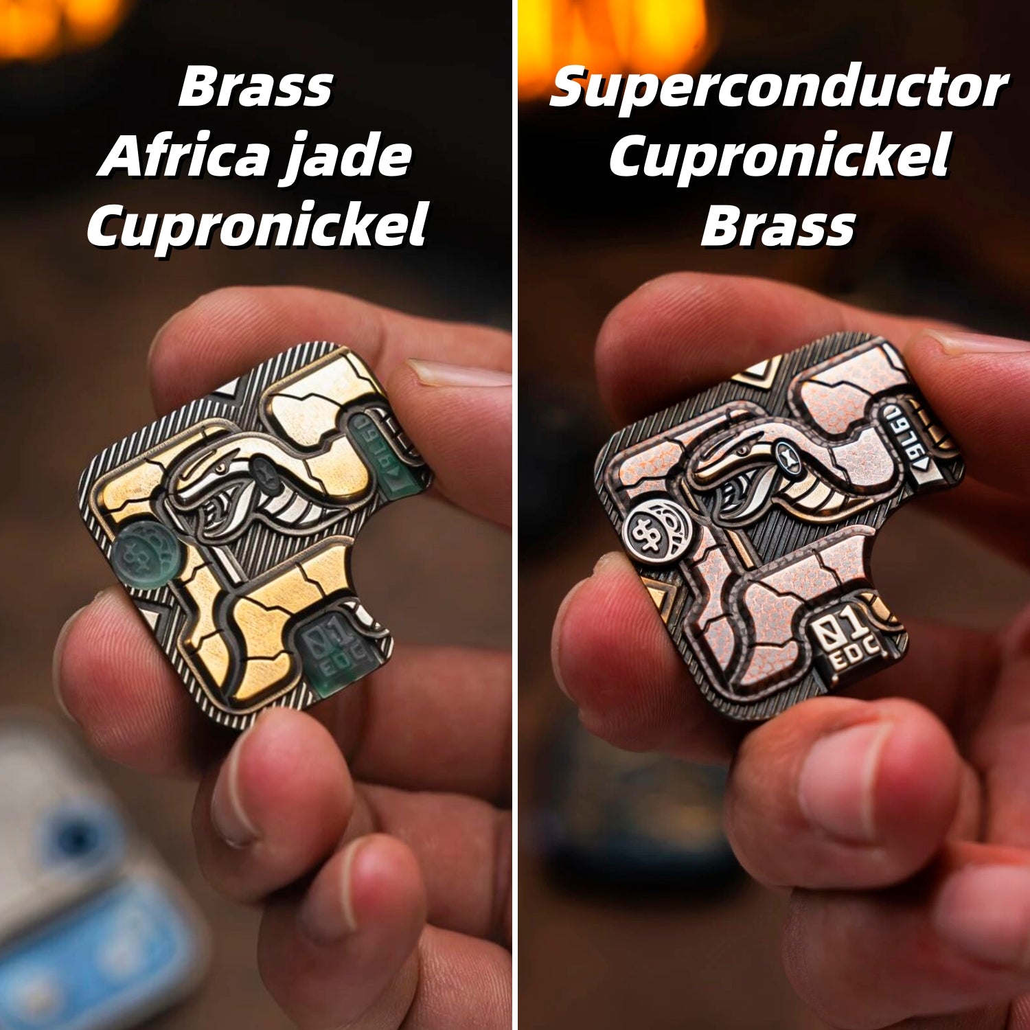 The thick texture of brass naturally exudes a sense of patina over time. The transparent green of African jade adds a finishing touch, while the delicate luster of cupronickel outlines the edges. The solid weight of the metal and the gentle touch of African jade create a wonderful balance. When handling it, one can feel the friction between the textures of different materials. And the more it is handled, the more gentle and patinated it becomes.
